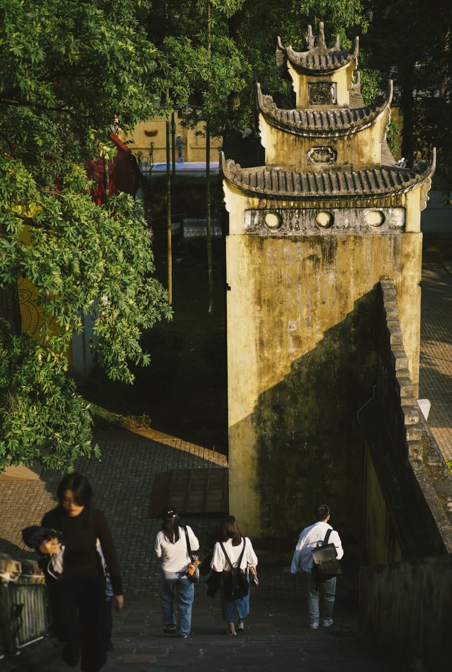 Golden sunlight casts shadows on moss-covered walls of the Thang Long Imperial Citadel