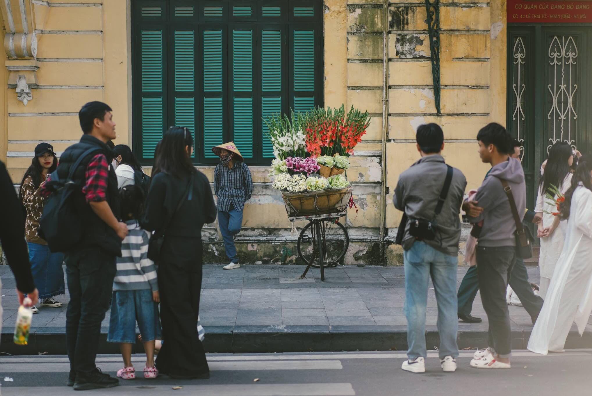 The pulse of Trang An Street – where old and new converge, as young people pause at a street corner beside a flower cart