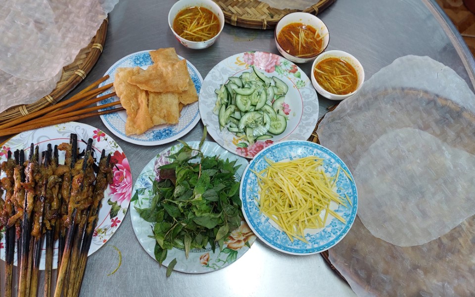 The diners dip two large pieces of rice paper in water, place them on a flat winnowing basket, add fresh vegetables, sliced cucumbers and mangoes, and layer it with grilled beef slices and fried spring rolls. The roll is wrapped and enjoyed with the dipping sauce.