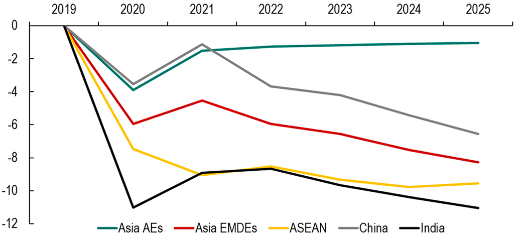 In the near term, the sharp slowdown in China’s heavily indebted property sector will likely spill over to the region, particularly to commodity exporters with close trade links to its largest economy. Beyond this, an ageing population and slowing productivity growth will further temper growth over the medium-term in China, amid rising risks of geoeconomic fragmentation, and bear upon prospects in the rest of Asia and beyond. In a downside scenario where “de-risking” and “re-shoring” strategies take hold, output could decline by up to 10 percent over five years in the Asian economies most closely linked to China’s economy.