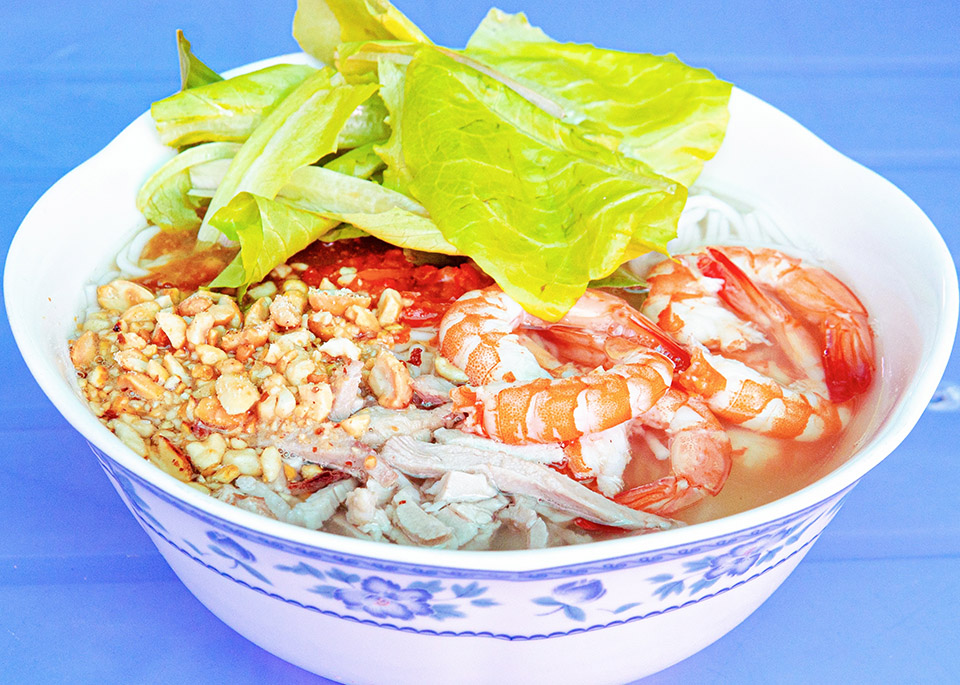 Evolving from the traditional Vietnamese fresh spring rolls (gỏi cuốn), bún gỏi dà has established itself as a signature dish of Soc Trang’s rich culinary heritage. The dish’s defining feature is its bold and flavorful broth, created by simmering pork bones, shrimp, tamarind, chili, and sugar. The inclusion of soybean paste mixed with roasted peanuts and fragrant garlic oil elevates the broth to a distinct and memorable level.