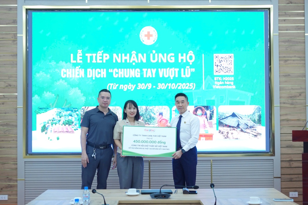 On the afternoon of October 9, in Hanoi, representatives of Care For Vietnam and its business partners visited the Central Office of the Vietnam Red Cross Society to present a symbolic donation of VND450 million in emergency relief for residents in Thai Nguyen, Lang Son, and Cao Bang provinces which have been severely affected by Typhoon No. 11.