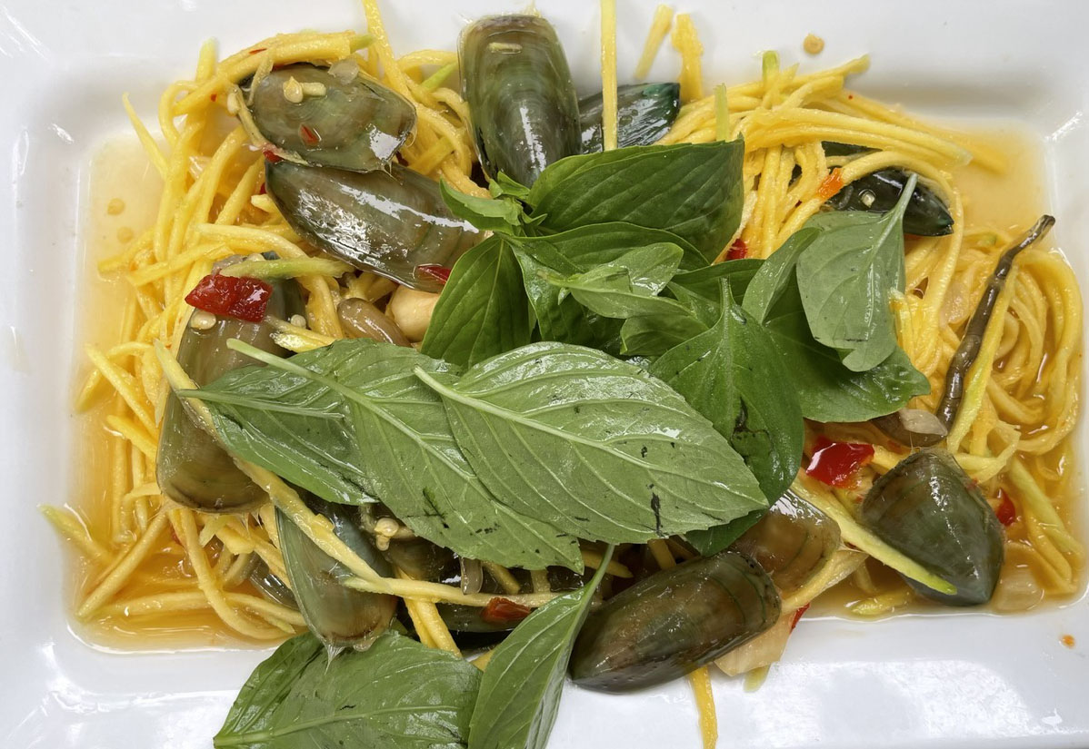 Cà xỉu, also called giá bể, looks like green mussels but has a shorter, rounder shell. Its most recognizable feature is a white, whisker-like appendage, three to five centimeters long, which is crunchy and rich in flavor. Locals often call it the “sea bean sprout” because of its appearance.