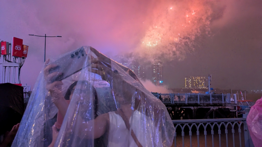 Spectators stand in the rain to watch the fireworks at Bach Dang WharfResidents capture moments in the rain with fireworks in the background