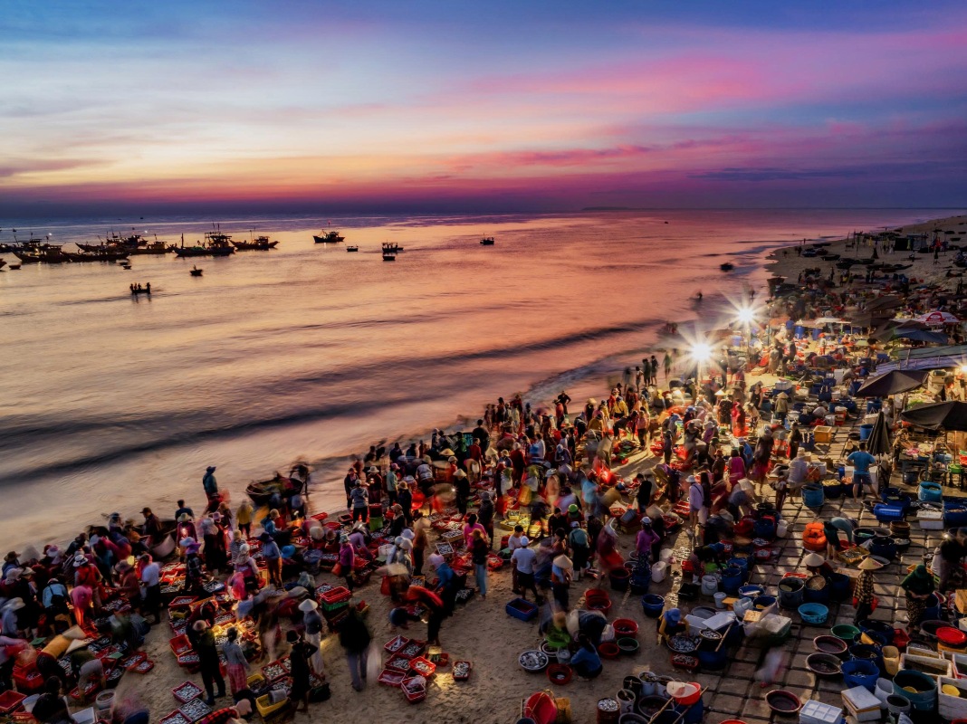 The market stretches across a wide, gently sloping sandy beach. From above, it comes alive in the soft glow of early morning—bustling with color and energy as hundreds of fishing boats return from a night at sea, docking in a flurry of activity that sets the rhythm for a new day.