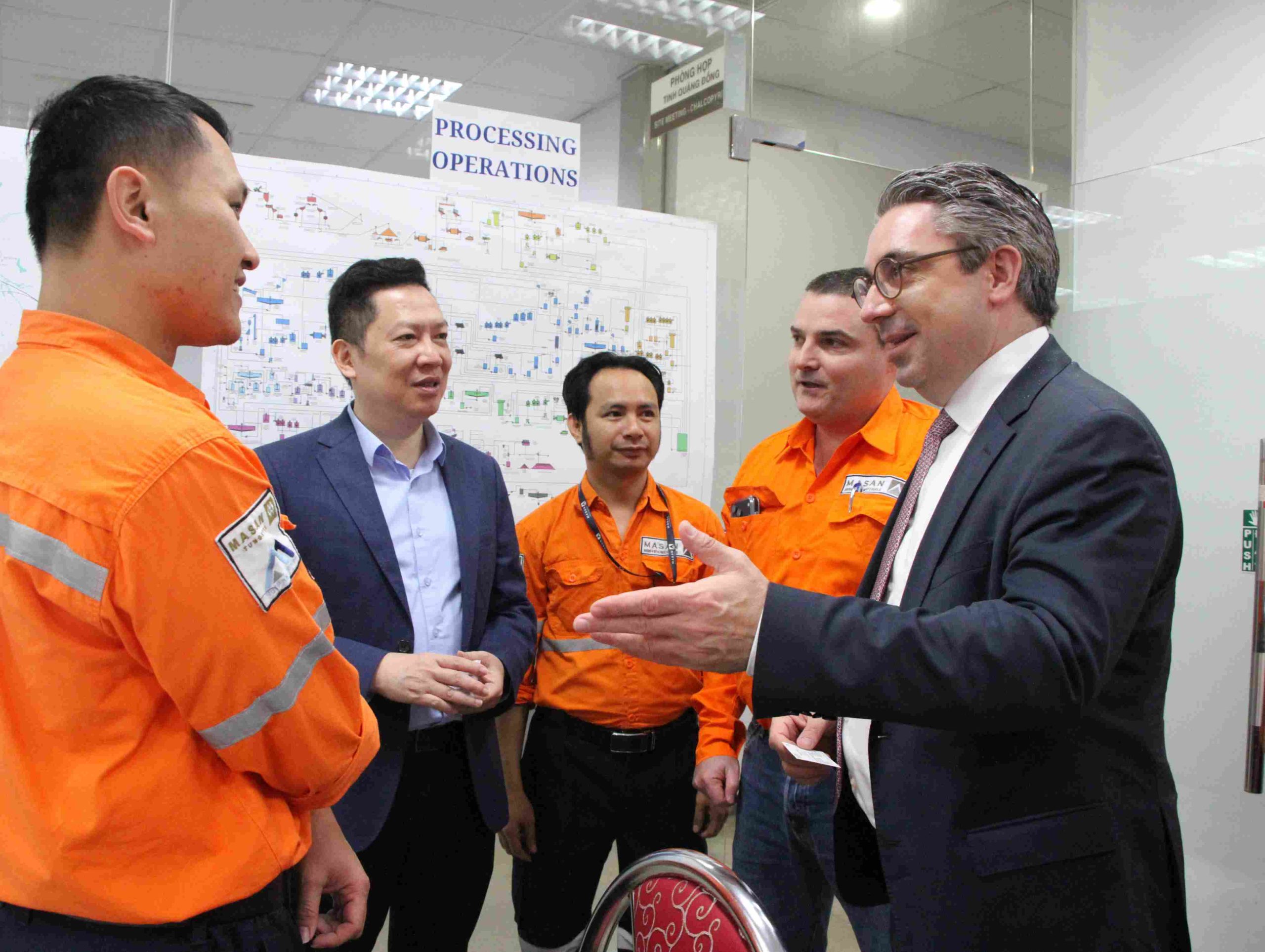 Welcoming the delegation, Ashley McAleese, CEO of Masan High-Tech Materials, highlighted that MHT owns the world’s largest primary tungsten deposit outside China, ranks among the top three global fluorspar producers, and is one of the few suppliers of primary bismuth worldwide. He provided an overview of the company’s mining and advanced processing capabilities, its strategy to develop high-tech materials, and its plans to expand international cooperation. Mr. McAleese later accompanied the delegation on a tour of the Nui Phao mine and MHT’s tungsten processing facilities.