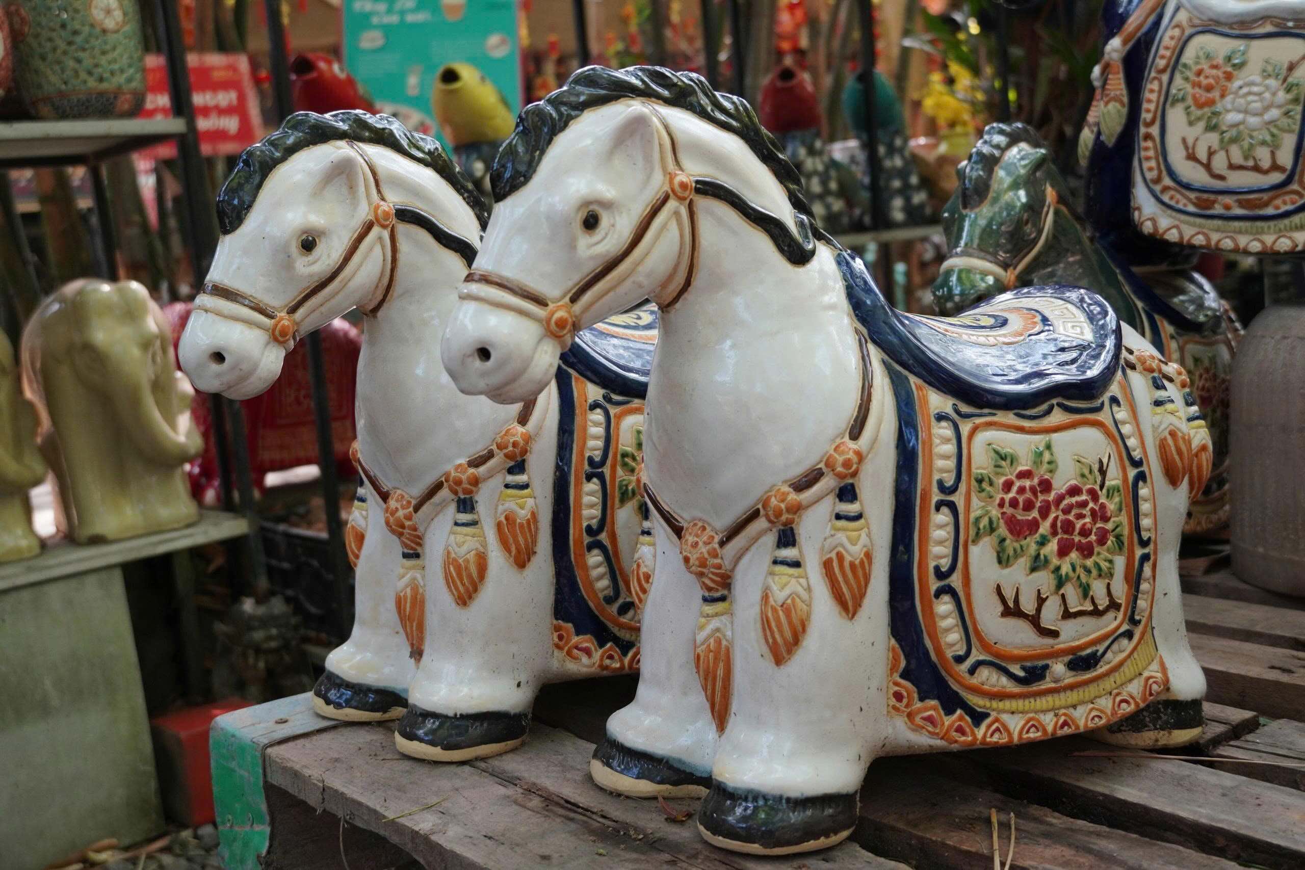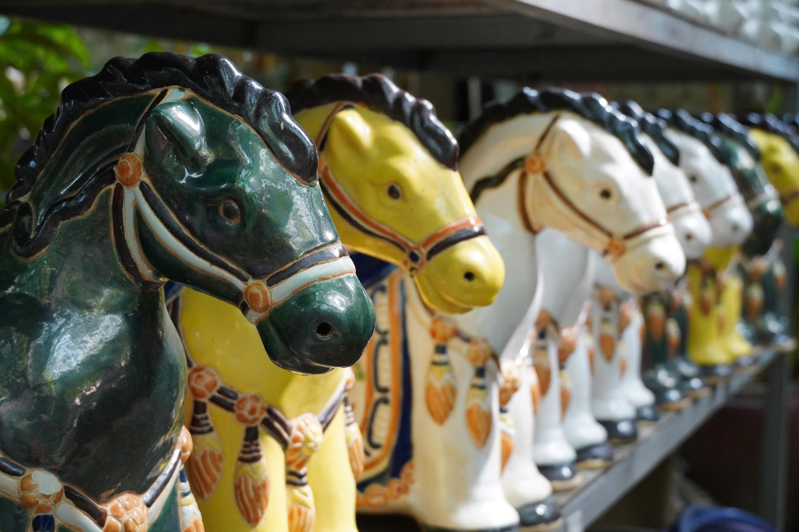 Decorated ceramic horse figures displayed to mark the Year of the Horse 2026, a zodiac symbol associated with vitality and forward movement in Vietnamese culture