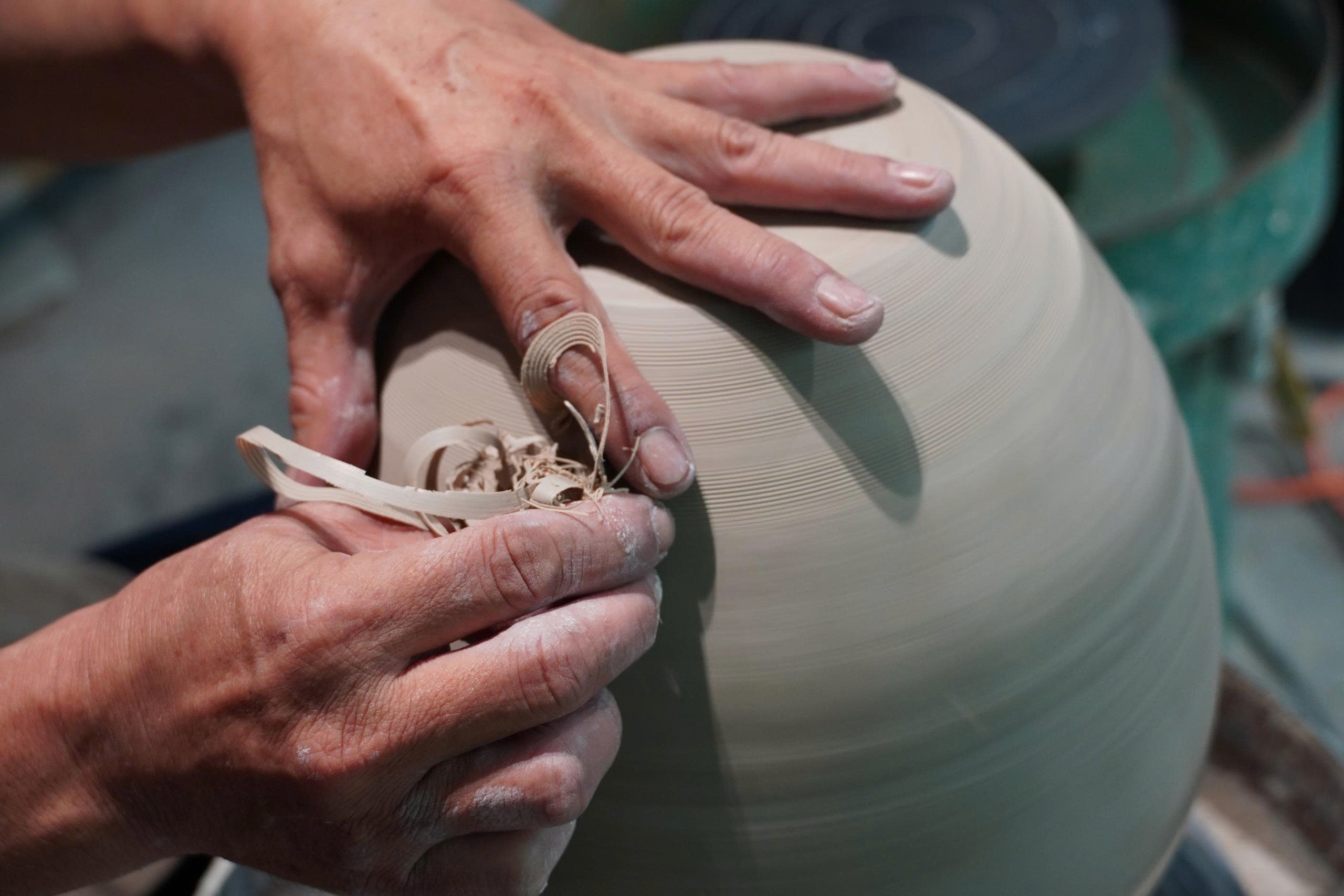 Within the open workshop and outdoor display areas, artisans work through each stage of production, from shaping and forming to surface decoration. At each worktable, clay is gradually transformed into finished forms, reflecting the rhythm and discipline of manual craftsmanship.
