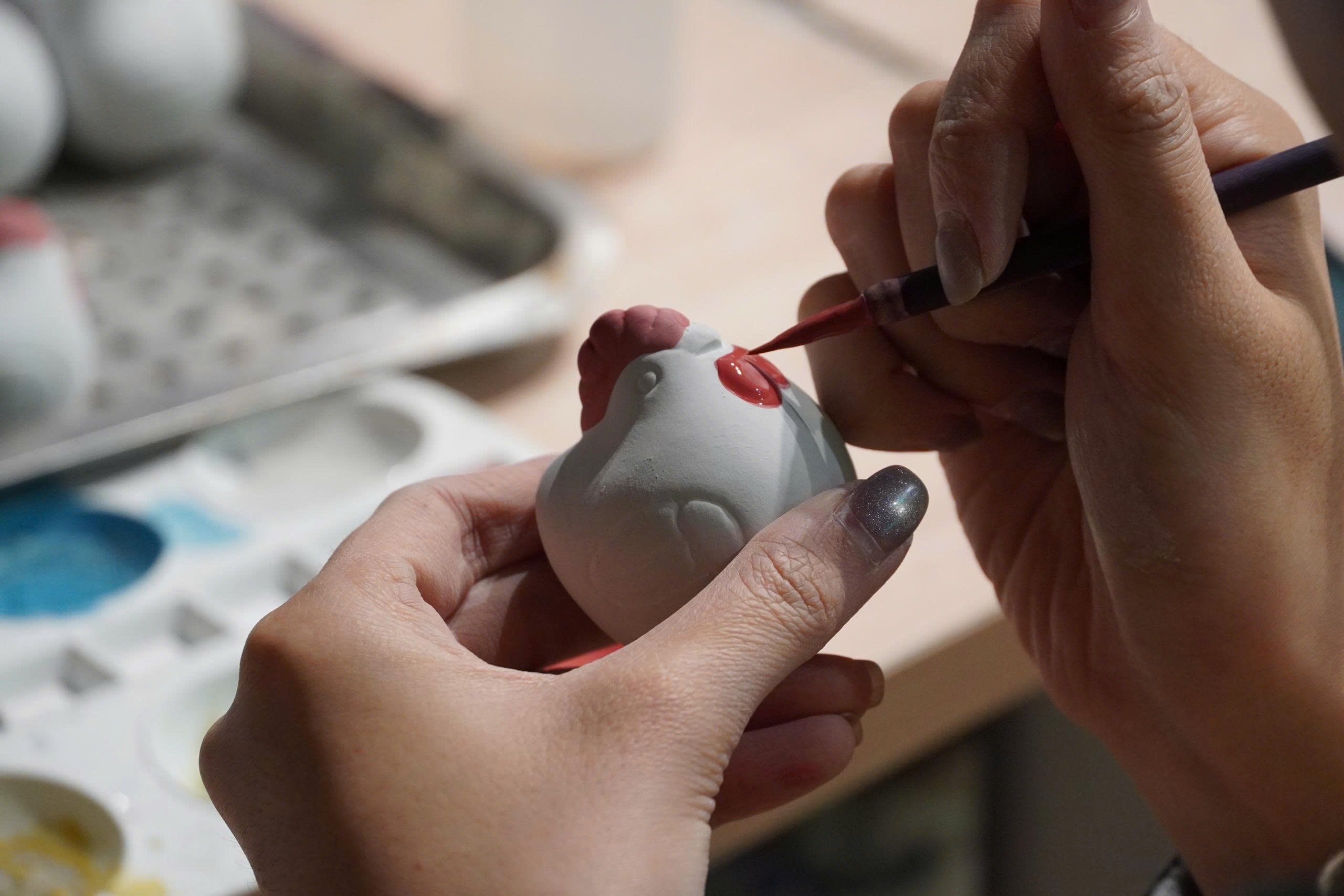Carefully painting details on a small ceramic rooster, a familiar motif in southern Vietnamese folk pottery
