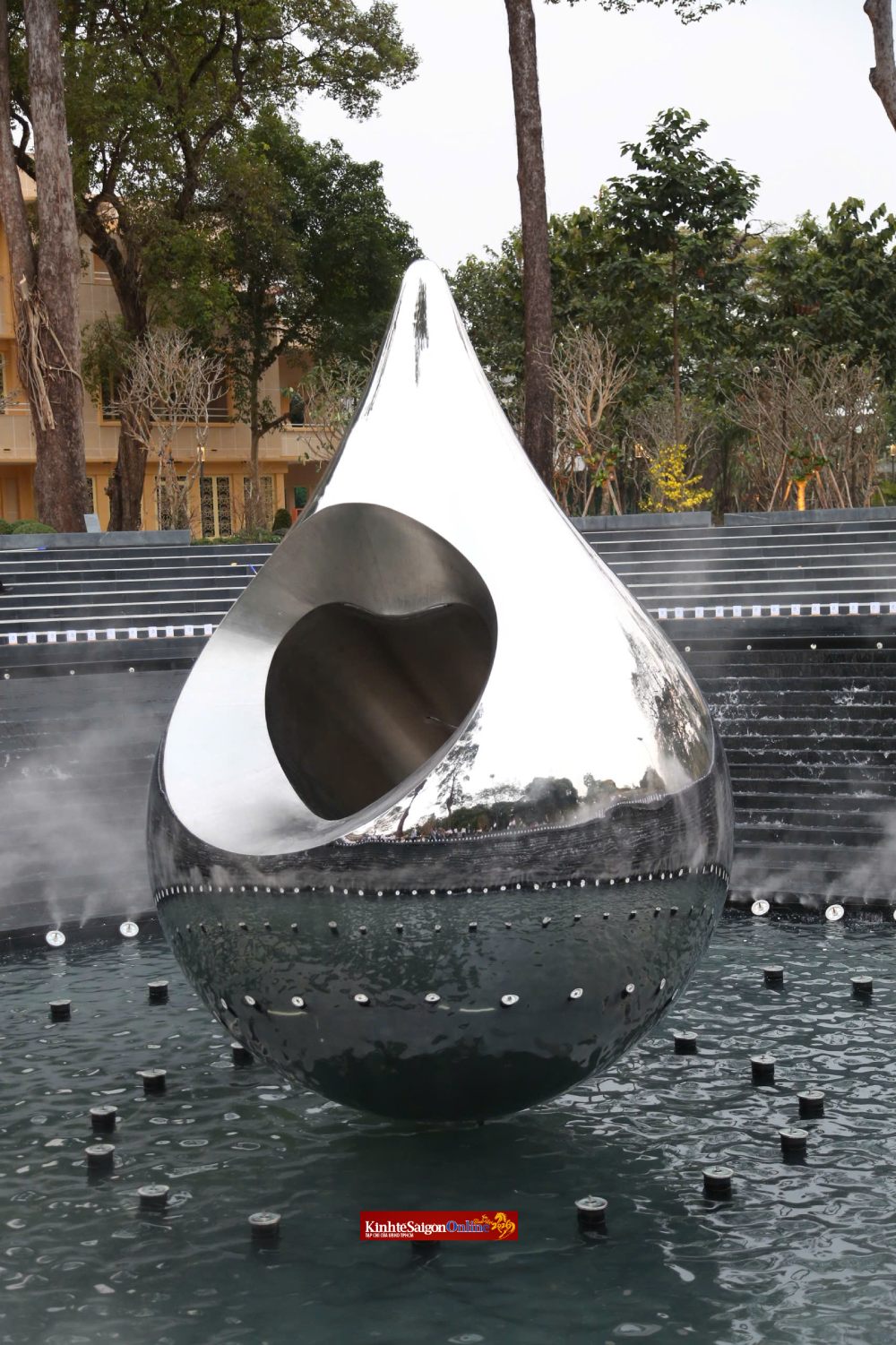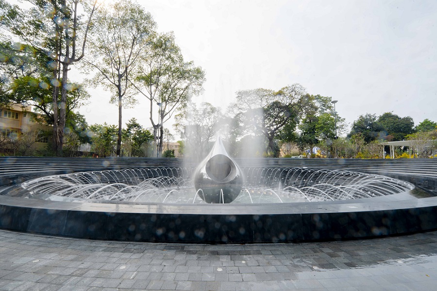 The 4.3-hectare site at No. 1 Ly Thai To, which had been left vacant for many years, was transformed into a park and a memorial fountain for Covid-19 victims, officially completed and opened to the publicThe project has received support and consensus from many HCMC residents for its community significanceA close-up view of the water drop-shaped symbol at No. 1 Ly Thai To Park