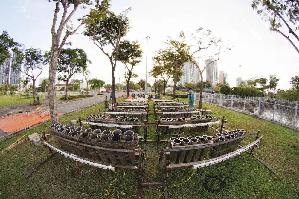 A high-altitude fireworks installation at the Saigon River Tunnel Park was set up today, February 16, to ring in the Lunar New Year