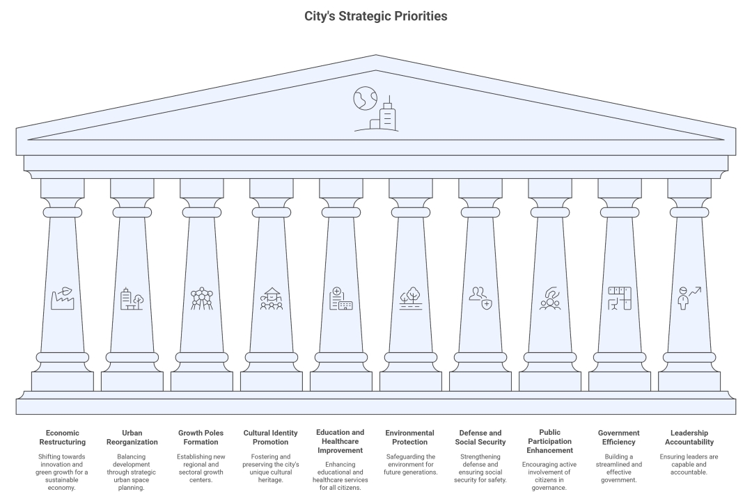 The city aims to improve education and training, attract and retain skilled workers, and apply performance-based indicators in public administration.