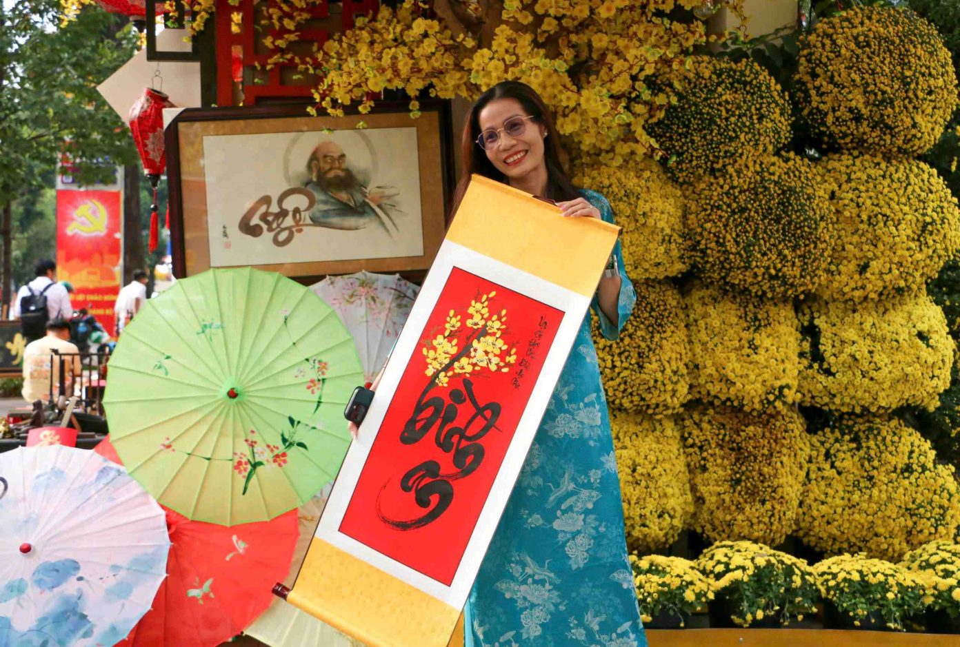 Since its opening, the calligraphy street at the HCMC’s Youth Cultural House (4 Pham Ngoc Thach Street, Sai Gon Ward) has consistently attracted large numbers of residents and tourists who come to watch calligraphers at work and request characters ahead of the Tet 2026Stalls displaying red paper, black ink, and traditional writing tools have become popular stops for visitors eager to learn about calligraphy and request characters for the new yearThe image of calligraphers grinding ink and writing on red paper has long been a familiar sight in Vietnamese cultural life whenever Tet approaches.Requesting calligraphy from scholars in the early days of spring is seen as a way of seeking “loc chu” (scholarly blessings), reflecting hopes for good fortune and smooth progress in the year aheadTwo visitors pose for photos in front of a calligrapher’s stall at the city’s calligraphy street ahead of TetA foreign visitor enjoy taking photos with her newly received calligraphy works, considering them symbolic blessings to carry into the first days of the new yearCalligraphic works are often displayed in prominent places at home, serving both as Tet decorations and reminders of the values and aspirations cherished for the new year