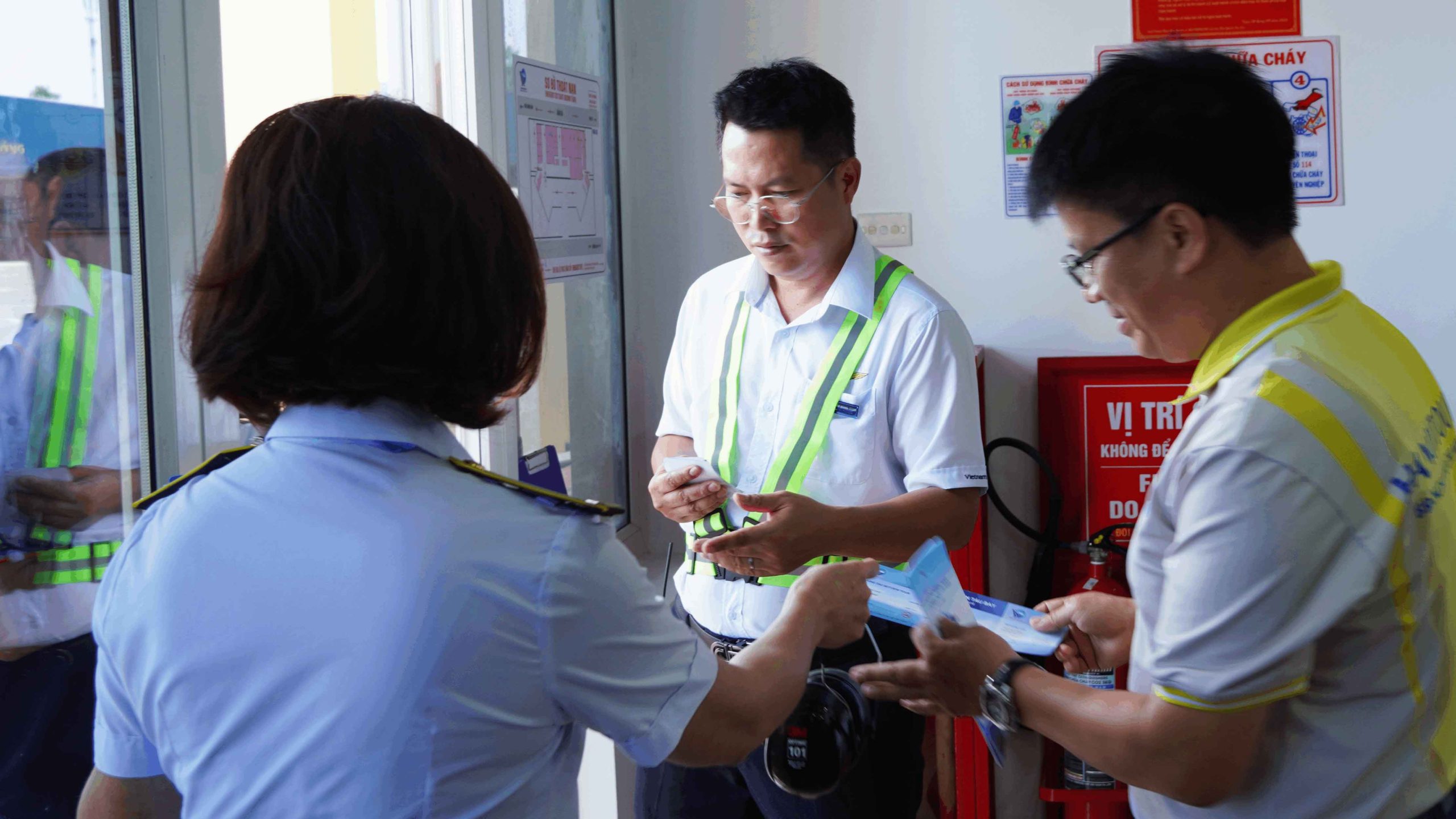 Passengers go through check-in procedures, receive a safety briefing before boarding. They are equipped with noise-canceling headphones