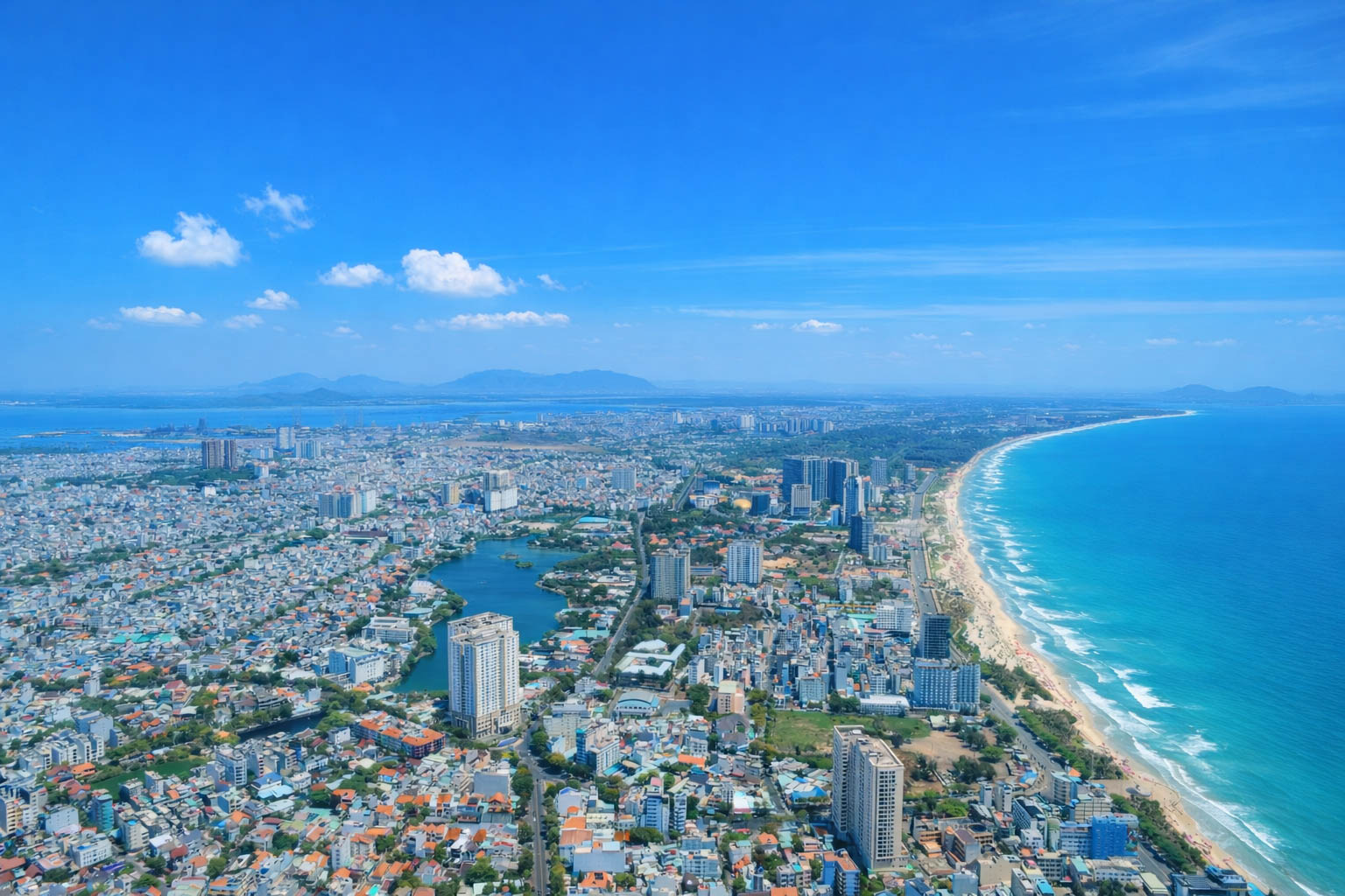 Through the cabin window, the panoramic beauty of Vung Tau unfolds with its vibrant neighborhoods and curving shores