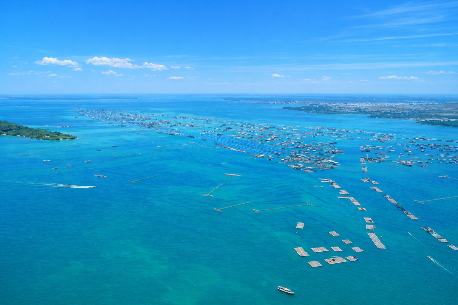 From above, the blend of deep blue sea, urban structures, and green patches creates a stunning coastal tapestry