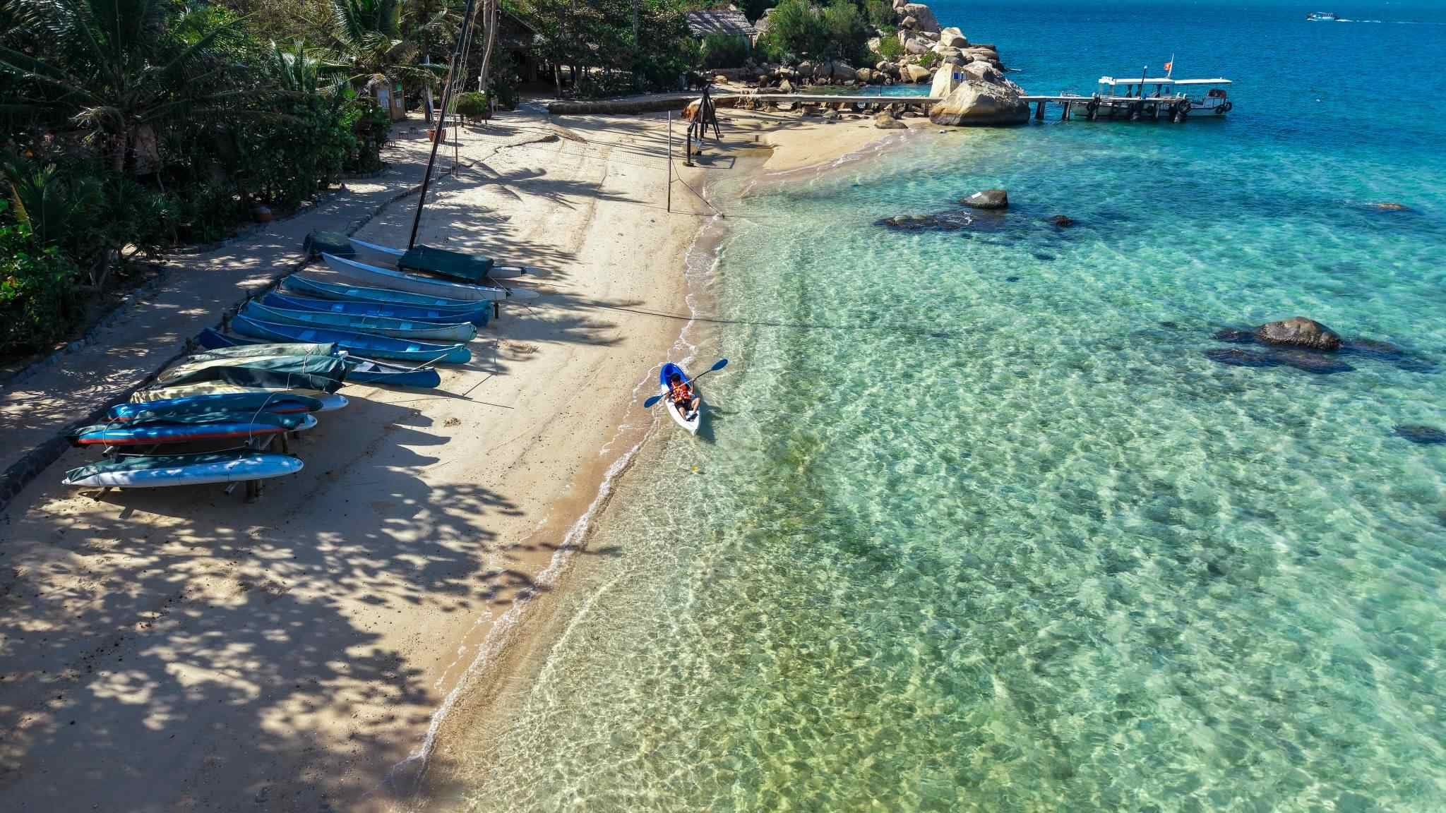 For outdoor lovers, the island provides a wide range of immersive activities. Visitors can start their day kayaking on the still, mirror-like surface of the bay or snorkeling to explore the vibrant coral reefs full of exotic marine life. For a panoramic view, a trek to the island’s viewpoint is a must. The trail meanders through shaded forest paths, ultimately offering a stunning 360-degree view of Van Phong Bay, where the sky and sea meet on the horizon.