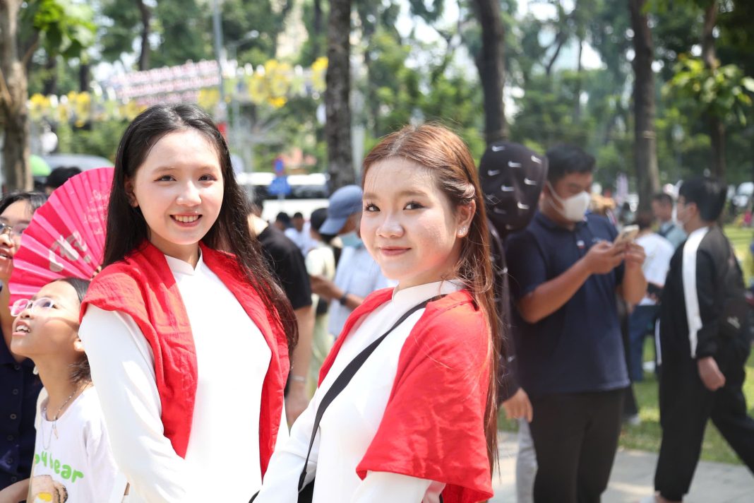 Many young visitors wore traditional and symbolic outfits, such as ao dai, youth union shirts, ao ba ba (a long-sleeved buttoned shirt paired with loose trousers), and conical hats. Some carried national flags while taking photos and touring the site.