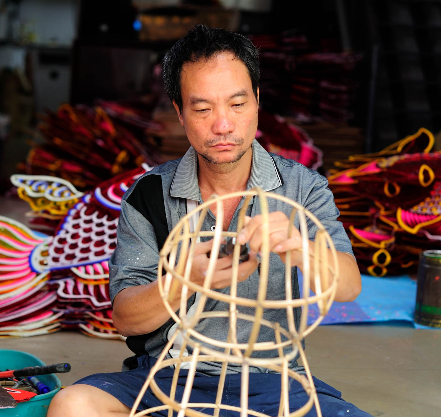 A craftsman carefully shapes the bamboo and wire frame for a lantern