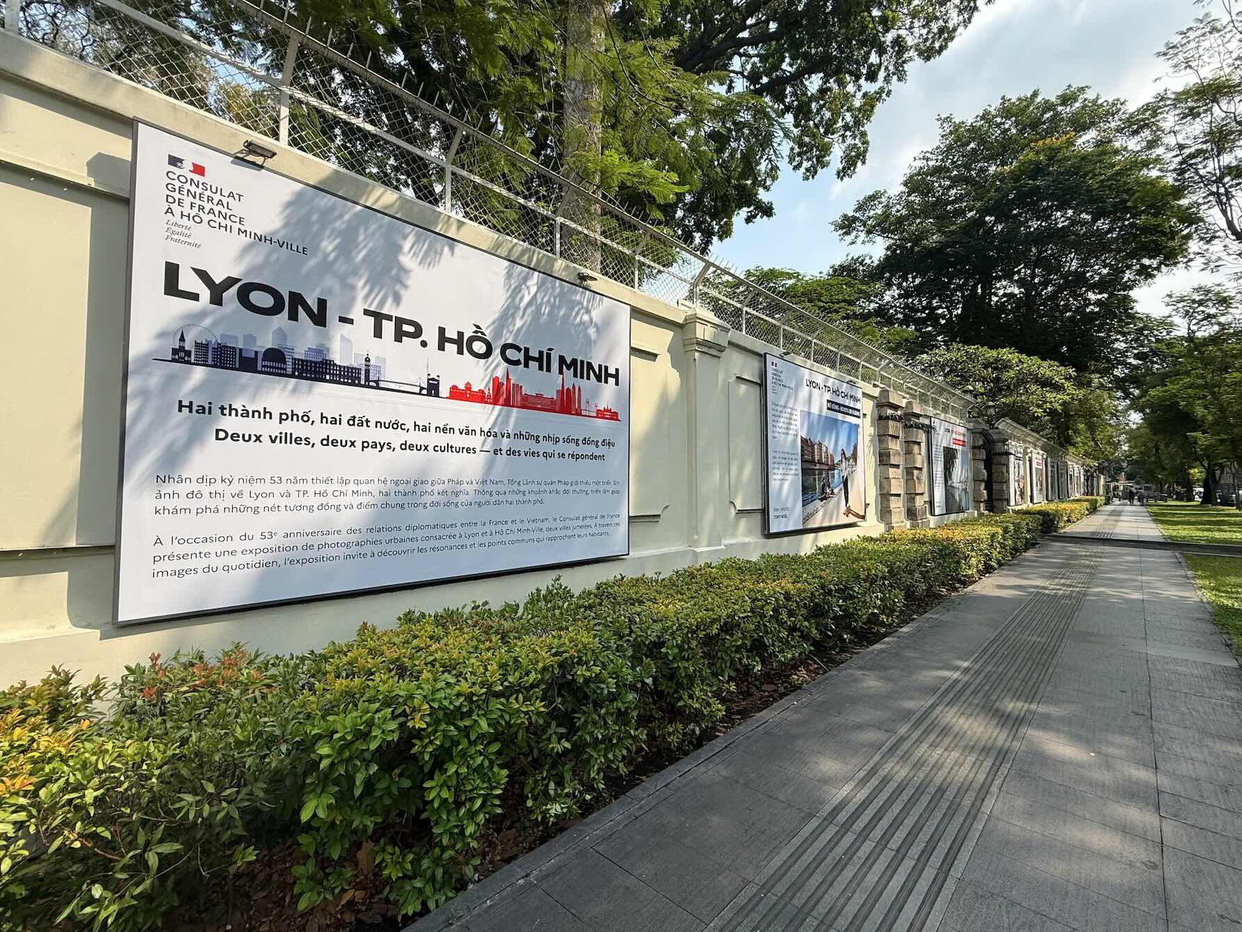 Large-format photo panels from the “Lyon – HCMC” exhibition are displayed along the outer wall of the French Residence on Le Duan Street in HCMC – PHOTO: THE KY