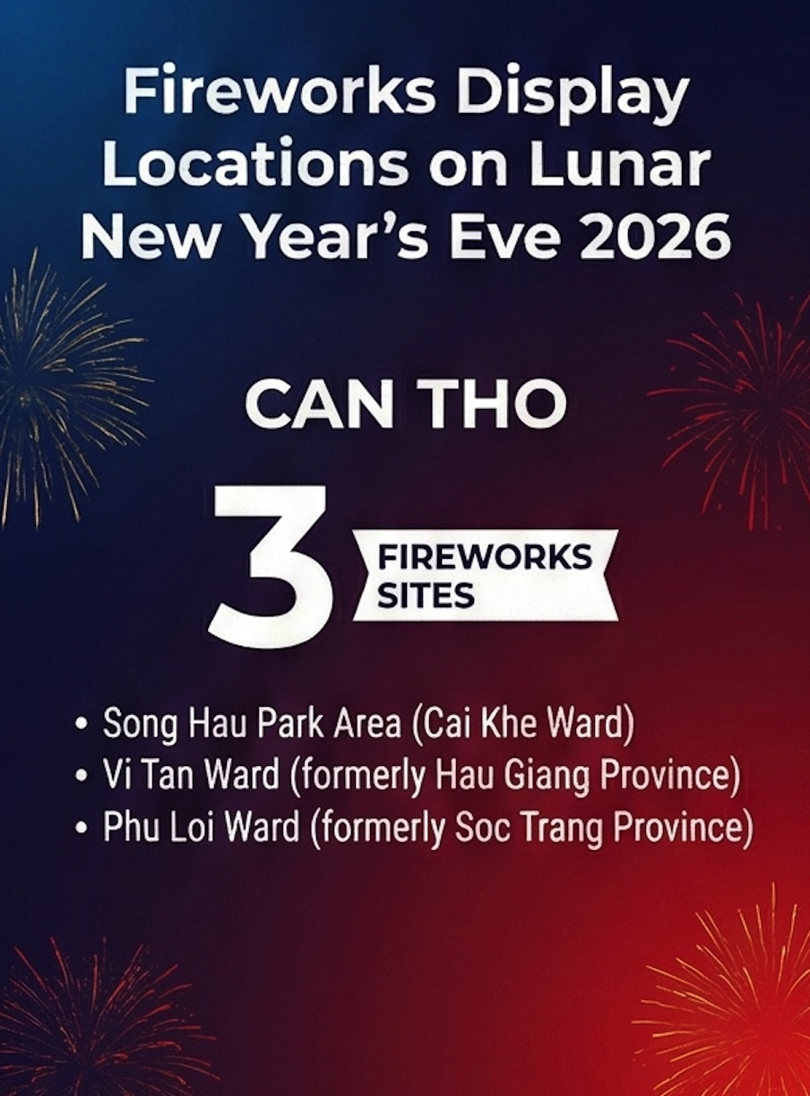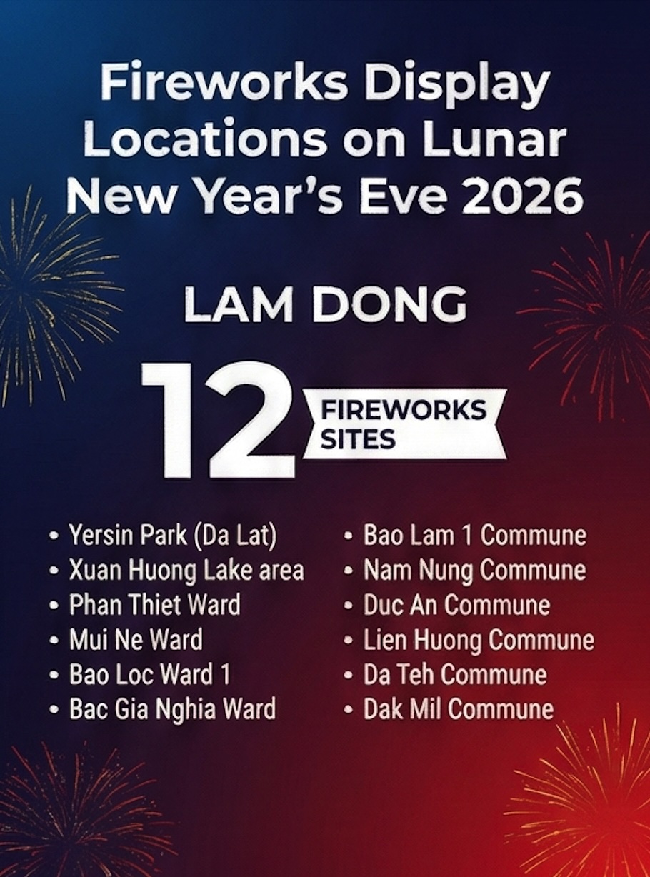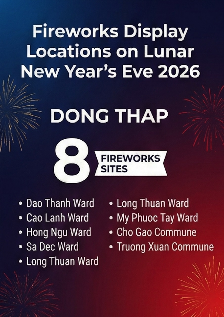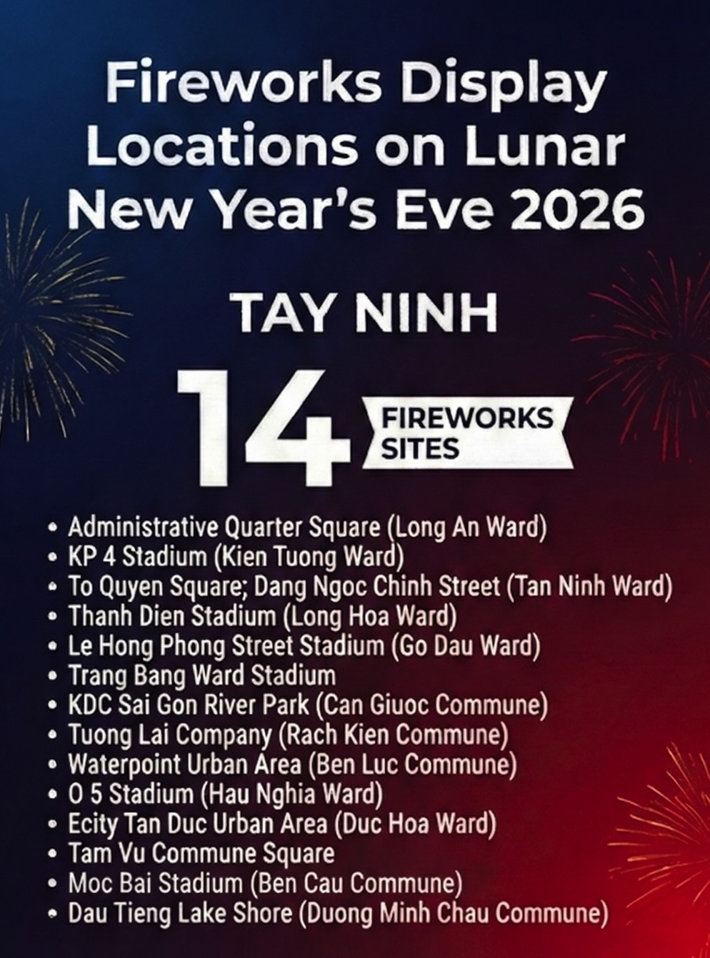 On Lunar New Year’s Eve 2026, several provinces and cities nationwide are expected to stage fireworks displays at multiple locations to ring in the new year. Tay Ninh will display fireworks at 14 sites, Lam Dong at 12 sites, while other localities such as Gia Lai, Vinh Long and Dong Thap will also organize fireworks displays across various areas.