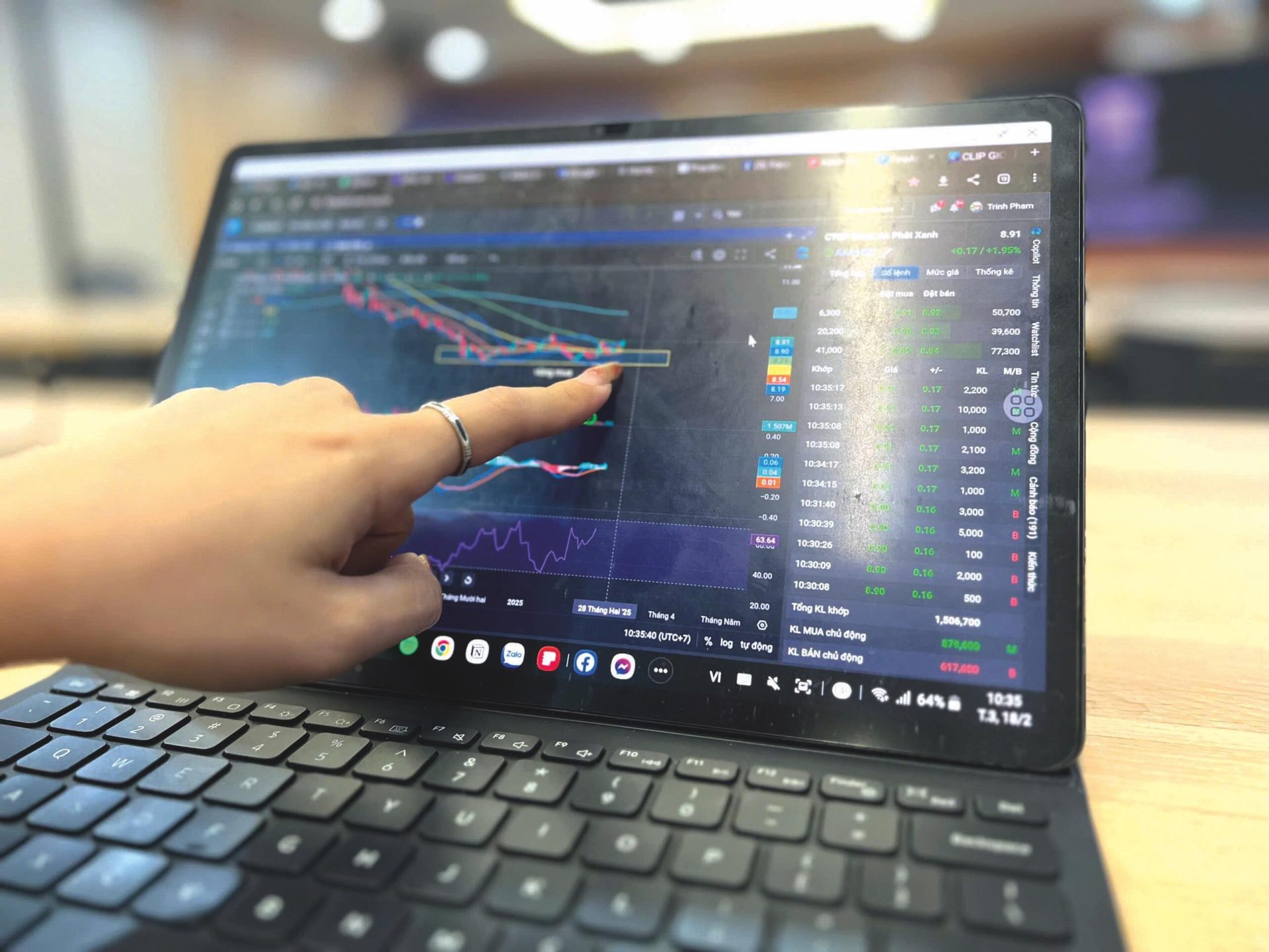 Real estate stocks led the market, with multiple tickers hitting their daily upper limit. DXS saw strong buying demand, while DXG rose 5.4% after touching its ceiling price. Industrial park stocks GVR and KBC hit ceiling prices, while SZL rose close to its limit.