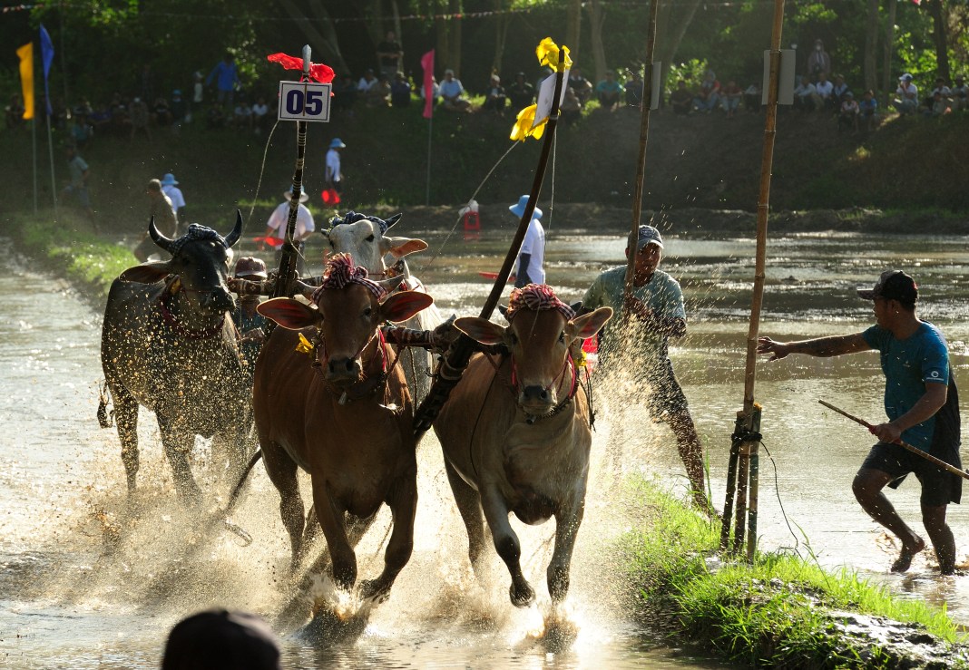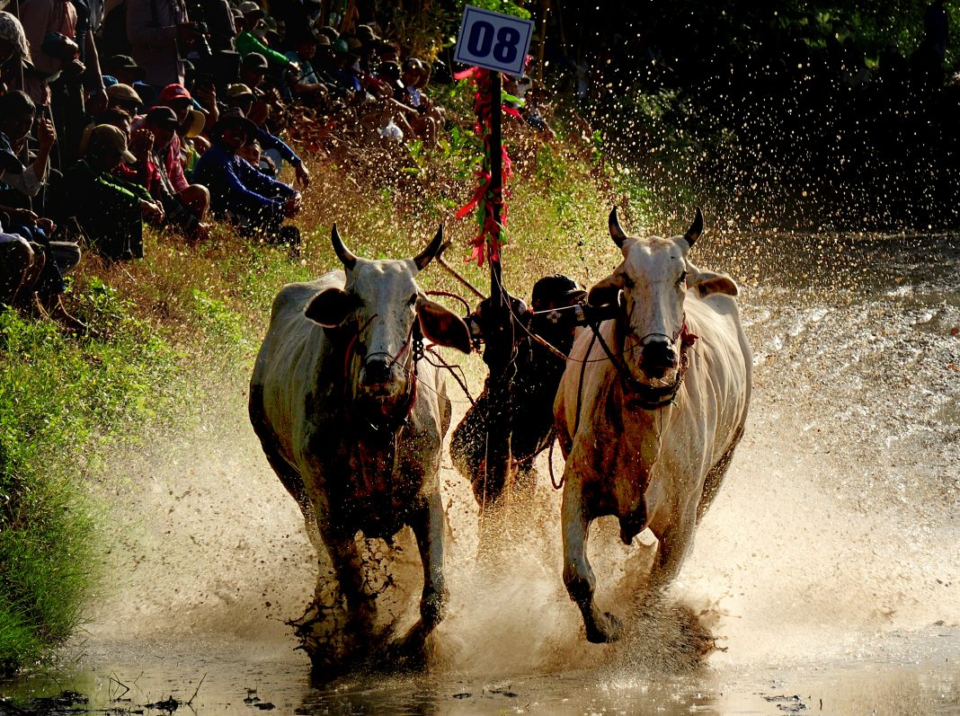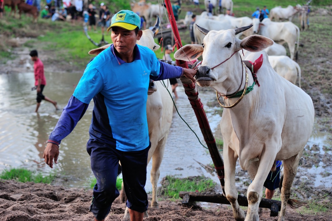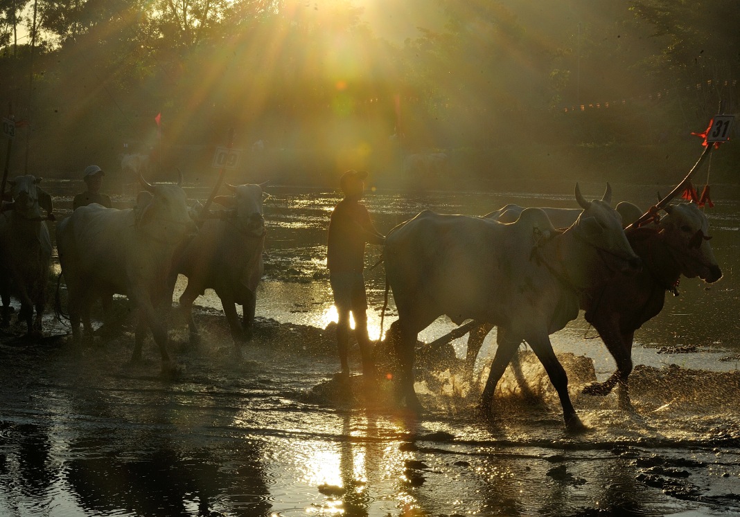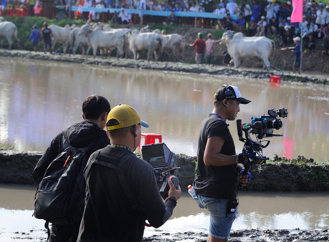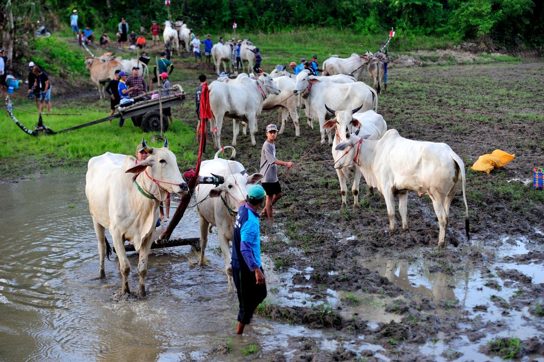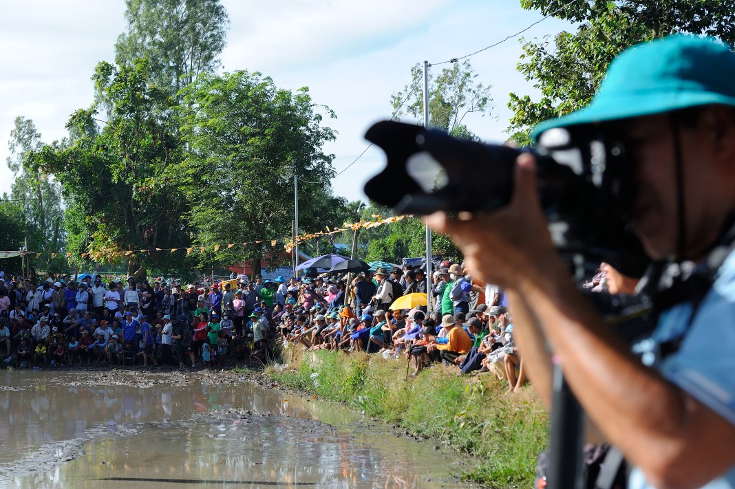The atmosphere is electric as the race unfolds right in the flooded rice field near the pagoda. A record 32 pairs of oxen compete, drawing enthusiastic crowds and hundreds of photographers eager to capture the exciting action.