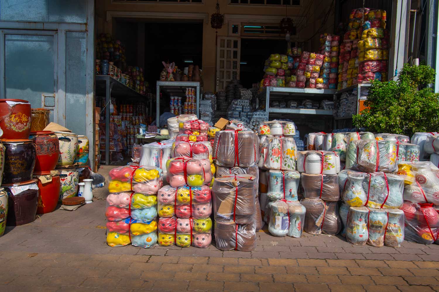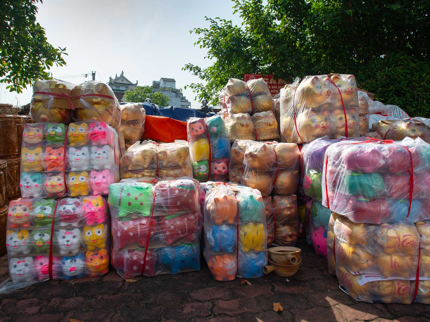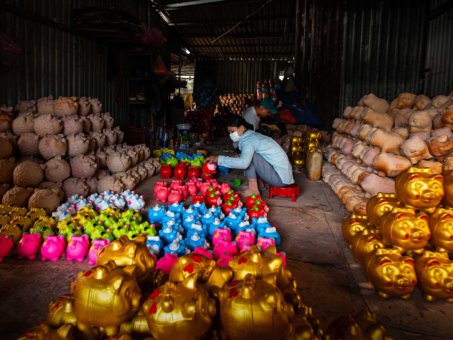 A variety of colorful piggy banks displayed at a wholesale shop in Lai Thieu