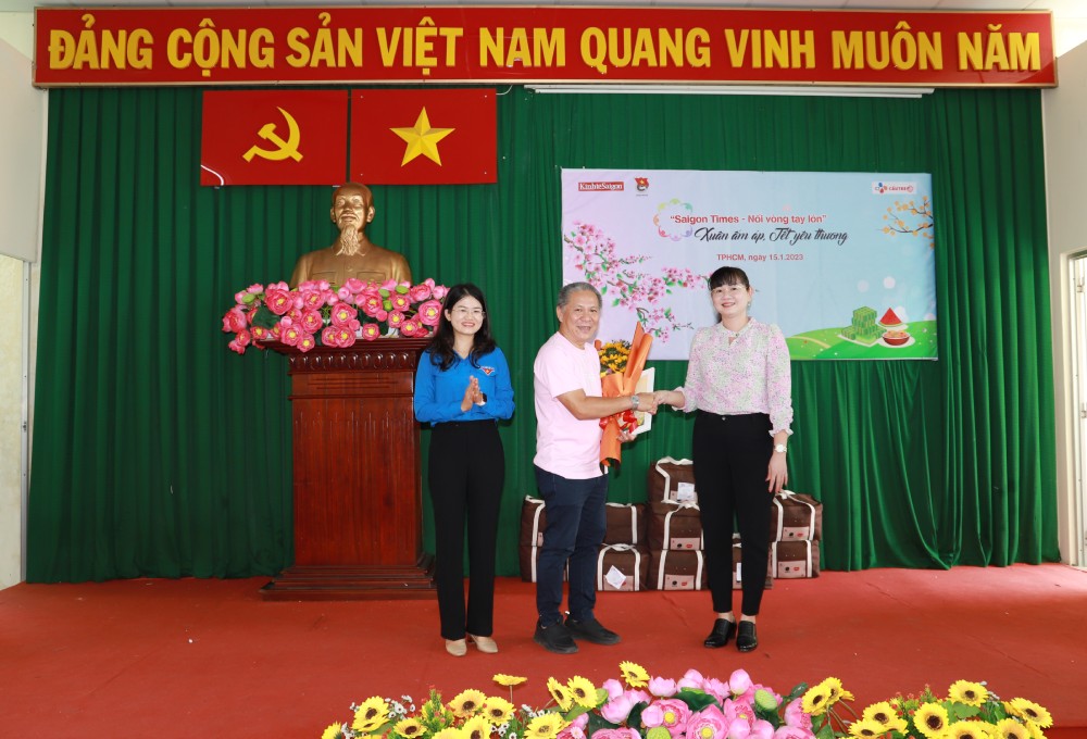 Tran Minh Hung, editor-in-chief of the Saigon Times Group, and Tran Thi Dung, Party secretary of Long Thoi Commune, Nha Be District, HCMC pose for a photo with gift recipients - PHOTO: THE SAIGON TIMES