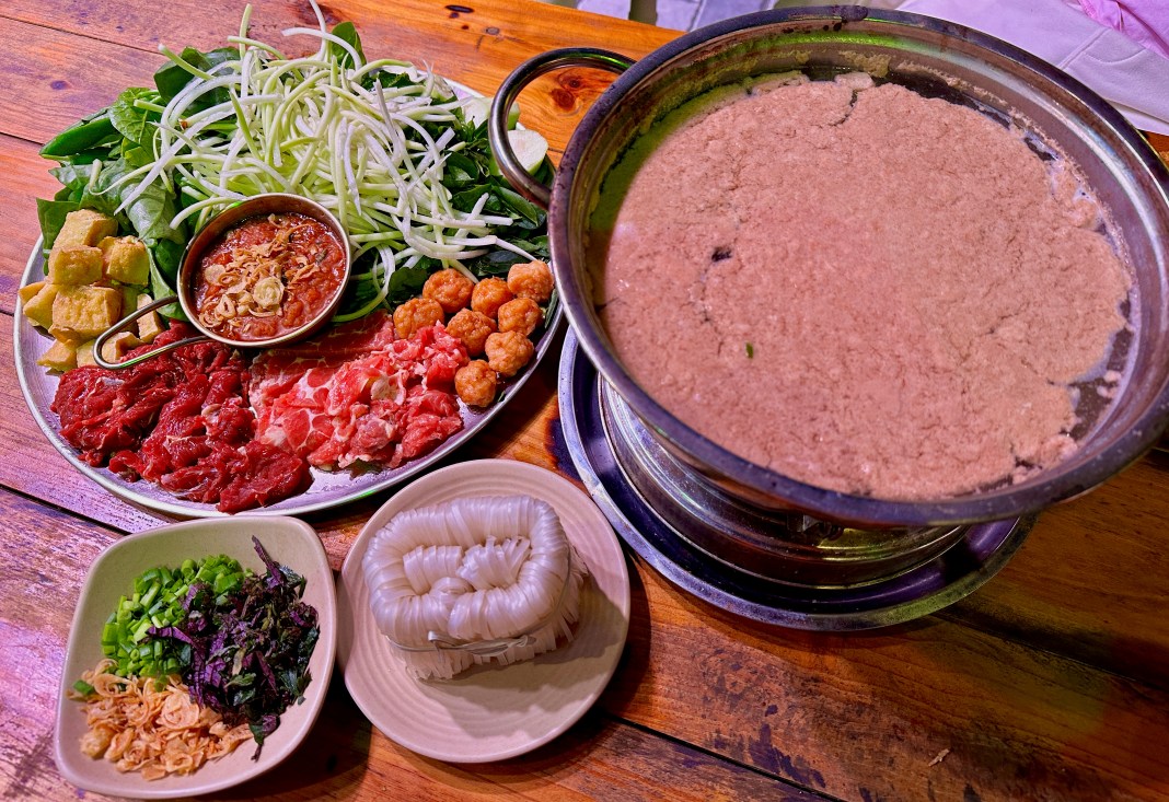The hotpot is accompanied by popular toppings such as crab cakes, pork balls, beef, and an assortment of fresh greens. It is typically served with various noodles like hủ tiếu, bánh canh, phở, or instant noodles, providing diners with a hearty, filling meal. A side of fish sauce or fermented tofu (chao) completes the experience.