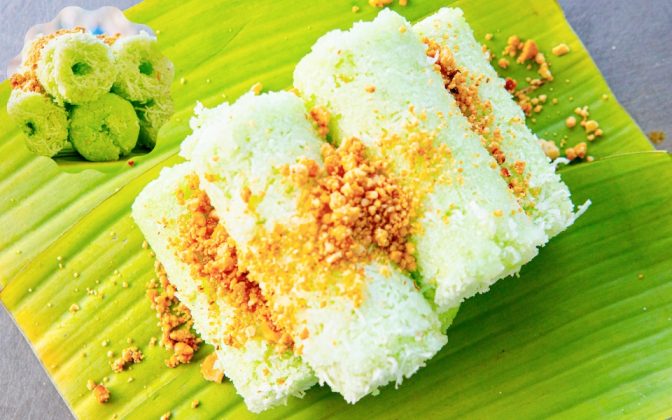 The result is a fragrant, lightly sweet cake with the creamy taste of coconut and the mild scent of pandan leaves. Some sellers add shredded coconut and crushed roasted peanuts or sesame seeds on top for extra flavor.