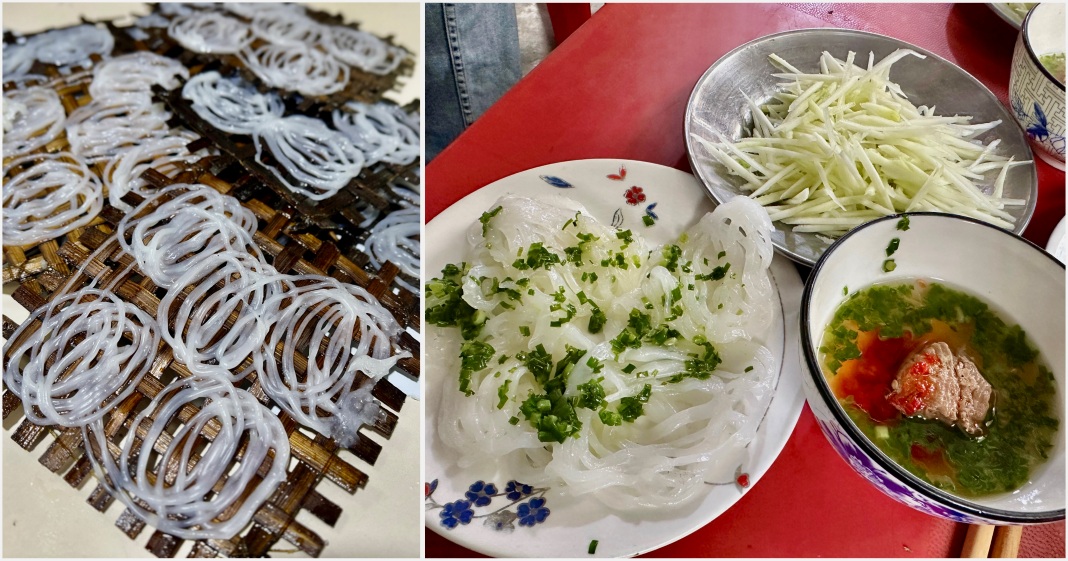 The name bánh dây refers to the noodle’s rope-like appearance. The dish is made from a mixture of rice flour and tapioca starch in a 2:1 ratio. The batter is thinned with water, then poured into a handmade cloth bag with small holes. The maker presses the dough through the cloth, pulling out thin strands onto bamboo trays before steaming them.