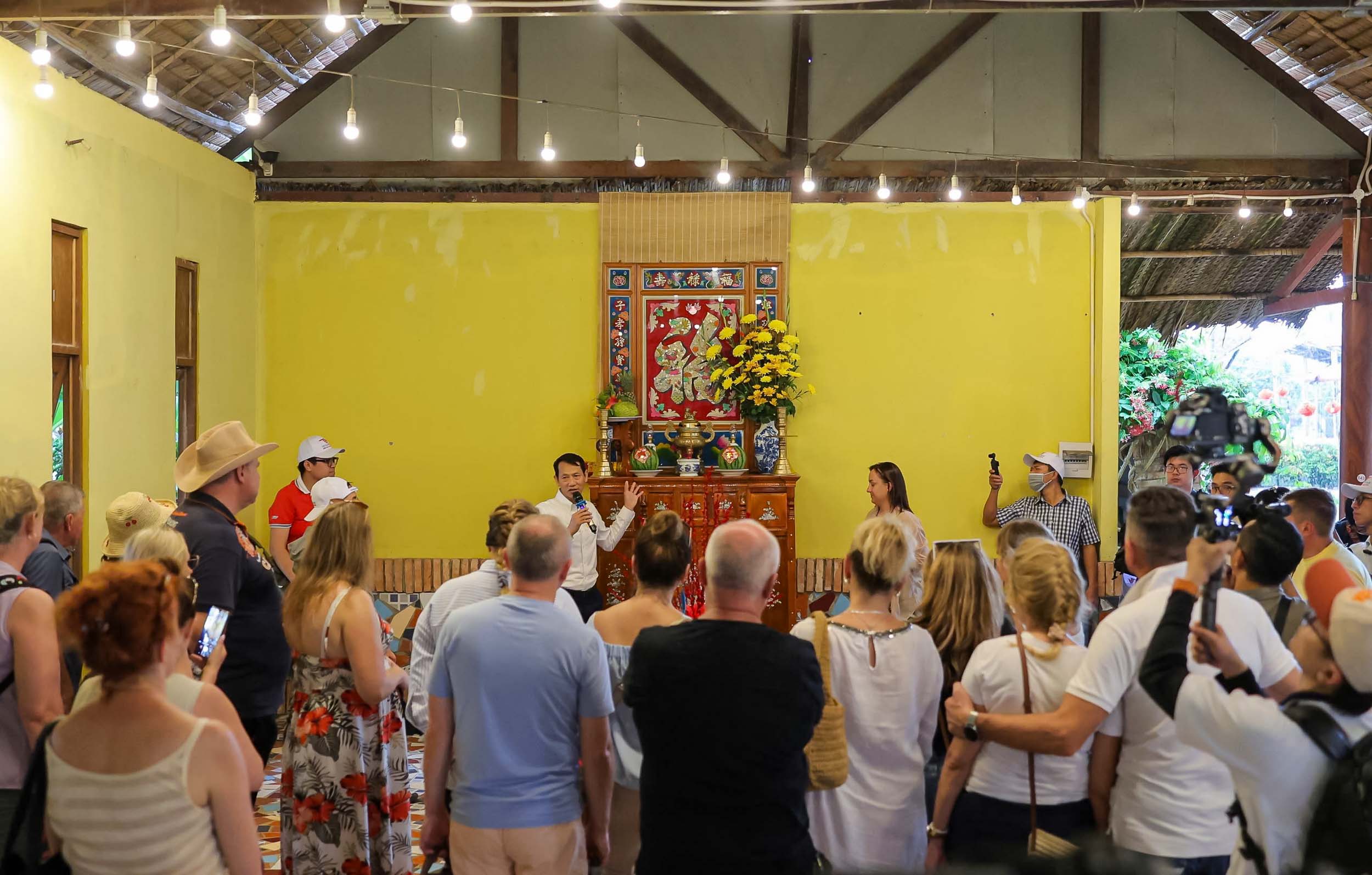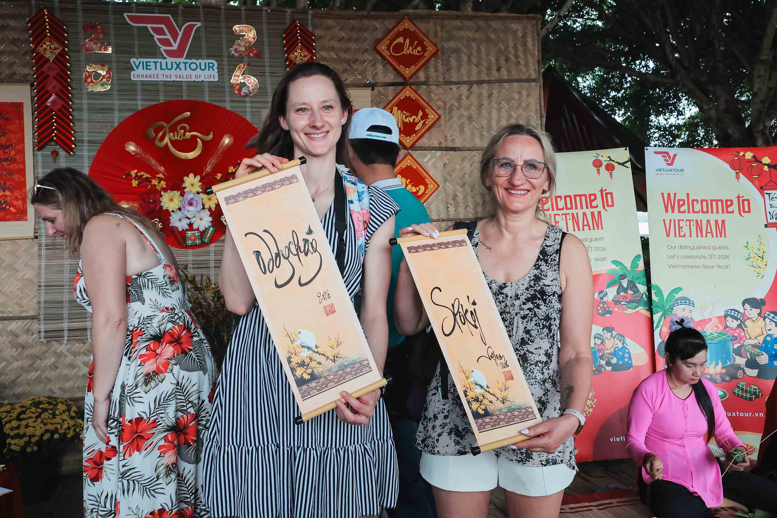 Activities included making banh tet (traditional cylindrical sticky rice cakes), cooking coconut jam, requesting calligraphy for good fortune at the start of the year, and visiting family ancestral altars. The tourists also shared a traditional Tet meal featuring southern Vietnamese dishes.