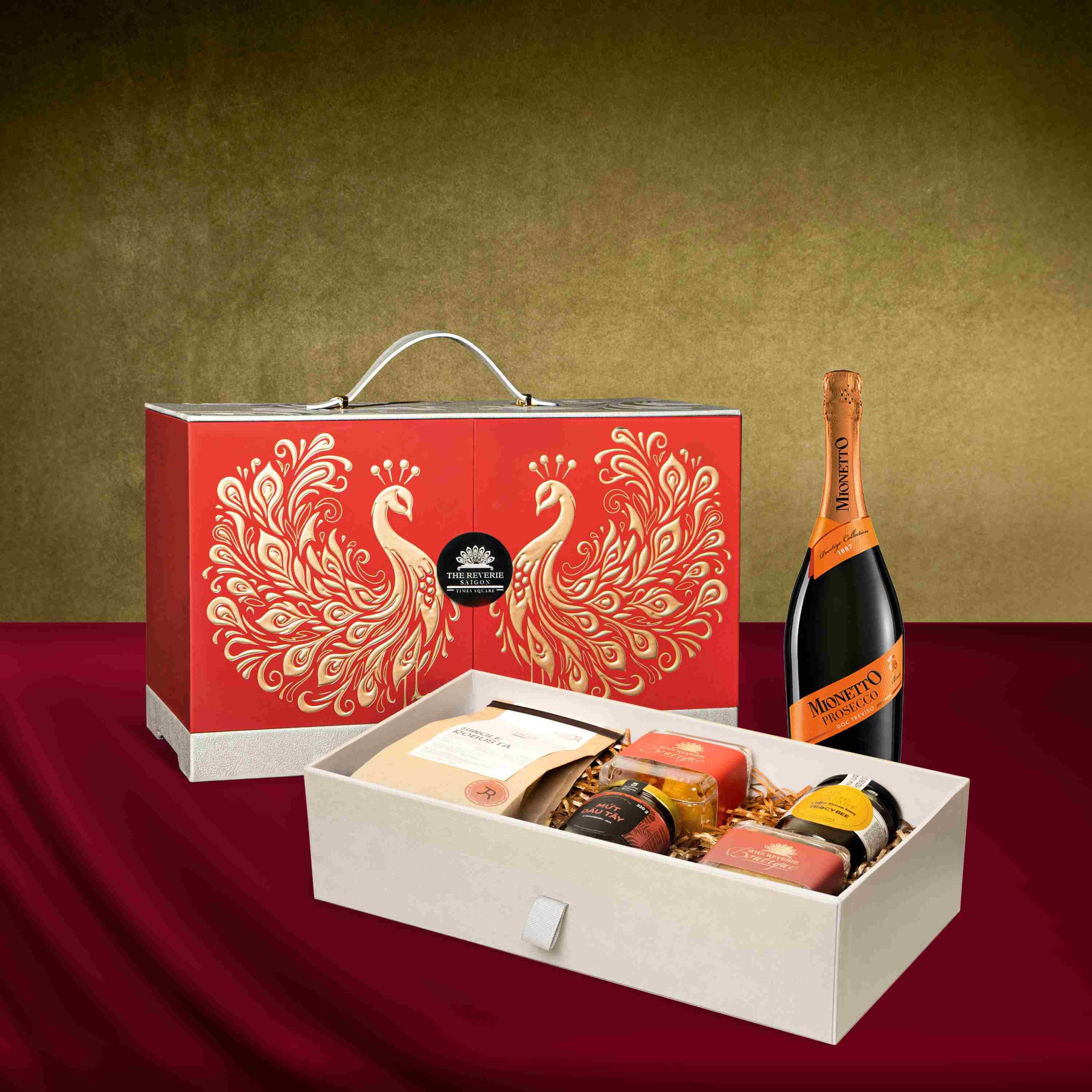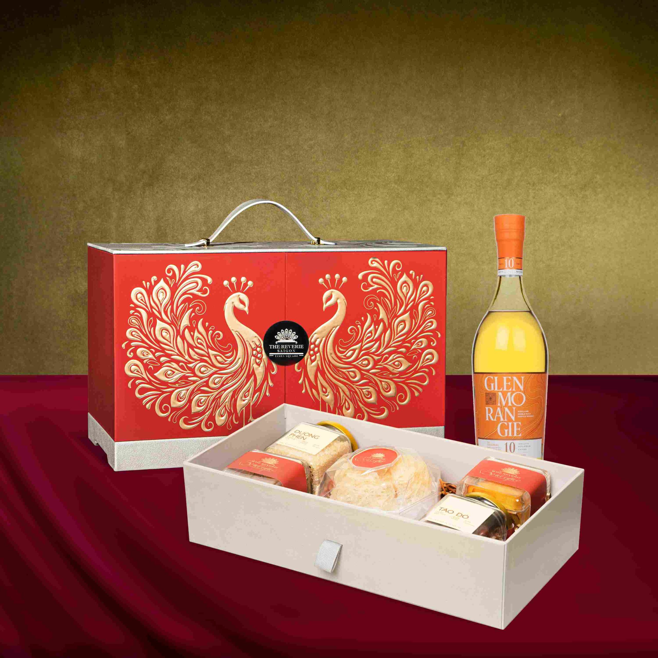 “The Bloom of Spendours” gift box is crafted from premium leather with metallic embossed patterns, featuring a pair of gold-plated peacocks framed by a soft red velvet backdrop, evoking an elegant and exclusive charm. This two-tier gift box includes a choice of Glenmorangie whisky or Prosecco, Vietnamese coffee set or premium bird’s net & condiment set, and dried fruits. Each gift box conveys heartfelt wishes of prosperity and good fortune from The Reverie Saigon to its valued guests.