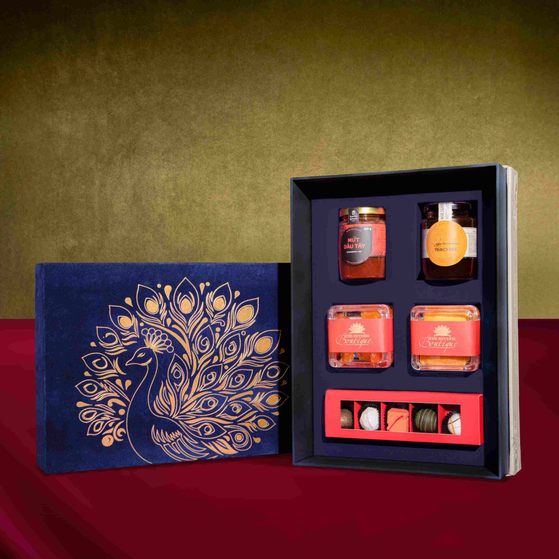 “The Sapphire Velvet Jewel” gift box is exquisitely designed with a gold-plated peacock motif set against a deep emerald-blue velvet background and leather base, evoking the image of elegant jewel. The gift box features premium chocolate, coffee flower honey, strawberry jam, dried papaya and mango, symbolizing wishes of peace and prosperity.