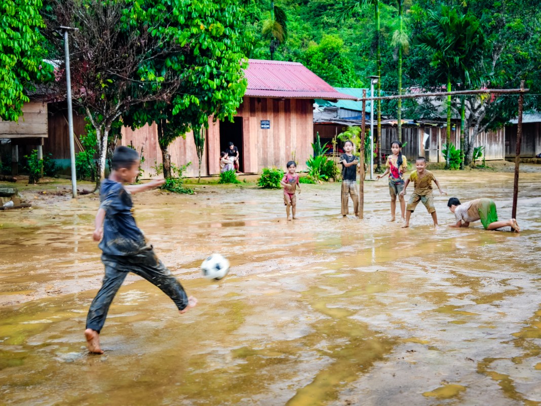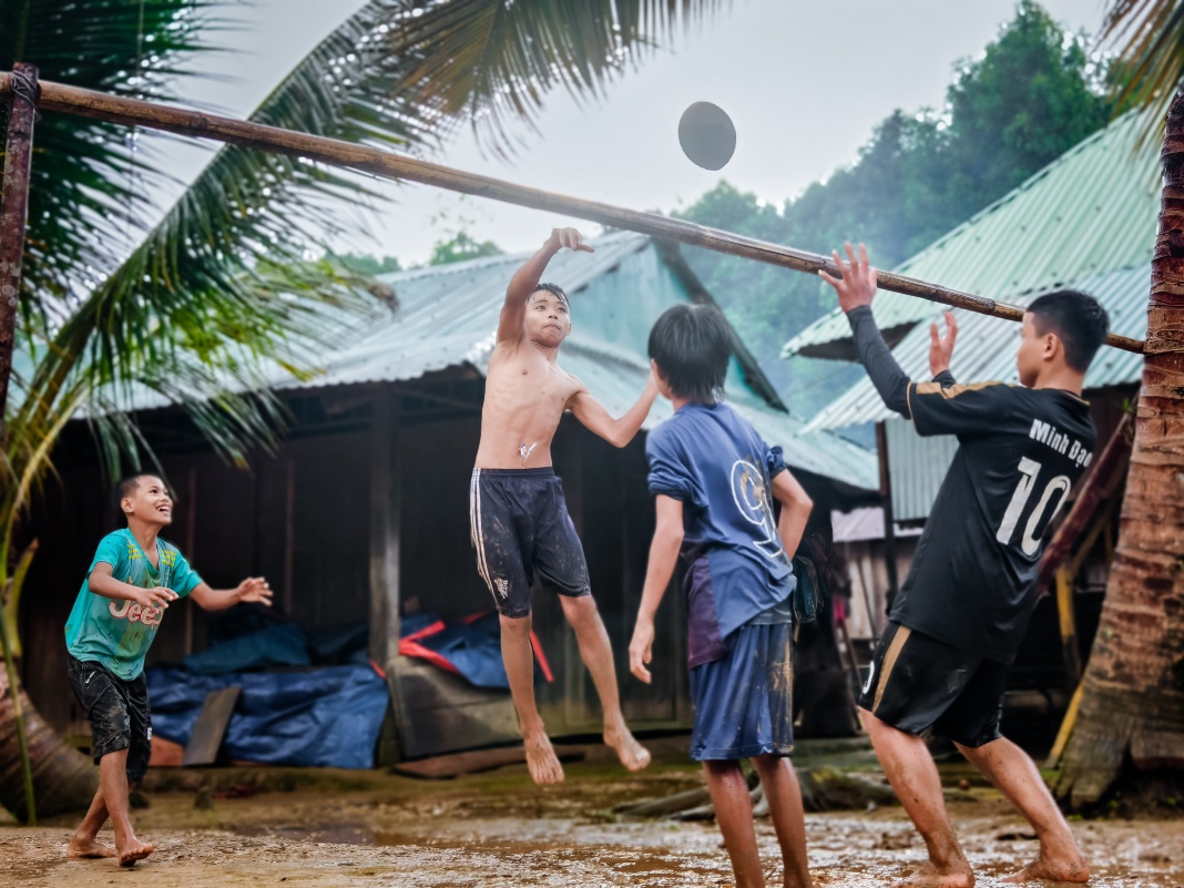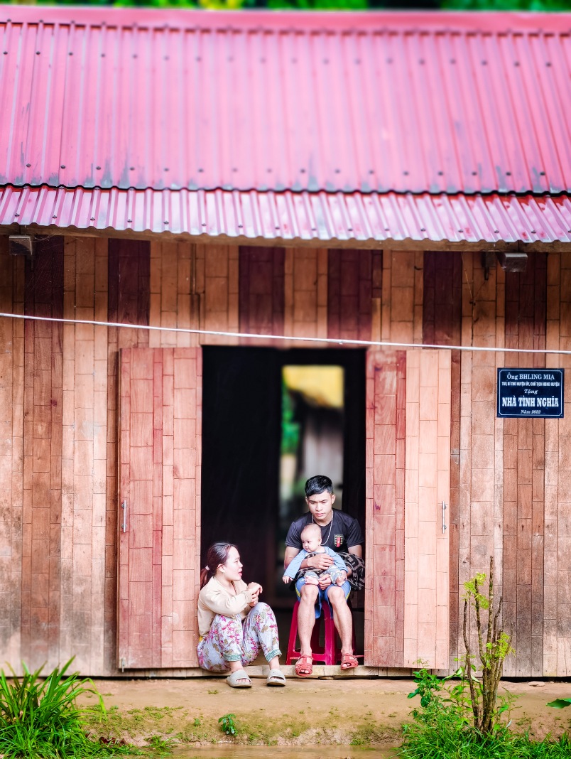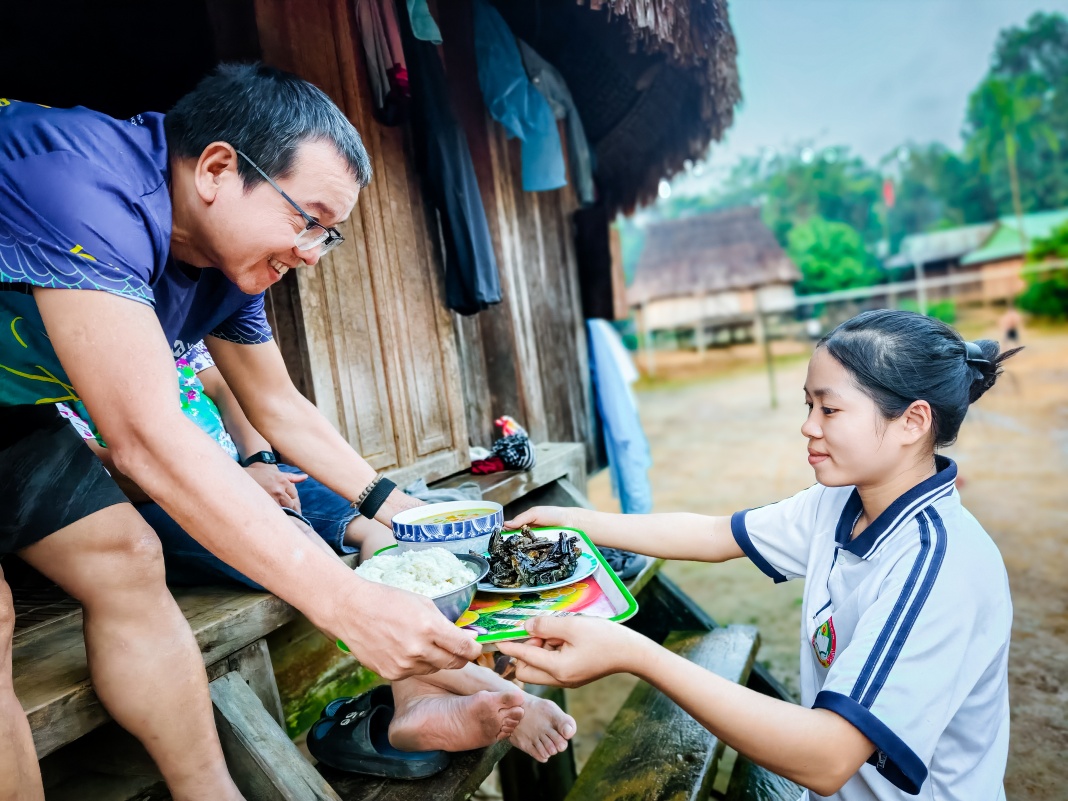 Aur Village is located deep within the Truong Son mountain range. The only way to get there is by trekking through the jungle and crossing streams.In the early morning, villagers gather outside to assist volunteers in carrying saplings and supplies into the villageAfter more than five hours, the group reaches the heart of the villageThe team treks through the forest and crosses streams on their journey to the villageTaking a break by the stream to regain strength for the onward journeyThen, it is time to rest and experience the simple life in AurChildren joyfully play sports, unbothered by the rainWhile their parents raise pigs…… or prepare food for their daily lives using traditional methodsA moment of rest for a young family in the villageThe villagers here are hospitable. Every home happily shares its meal with visiting guestsThe warm hearth inside the communal house, a.k.a. Guol, provides welcome warmth for guests in the highlandsThe next day, as part of the “A Little Vietnam” project, the enthusiastic young volunteers join the villagers in crossing the stream to work on their upland fieldsThey not only instruct on the correct techniques for planting and tending fruit trees but also sow the seeds of hope for a better lifeThis trip is more than just delivering necessities before the rainy season; it is about conveying a profound message of environmental protection and promoting a green lifestyle within the younger generation