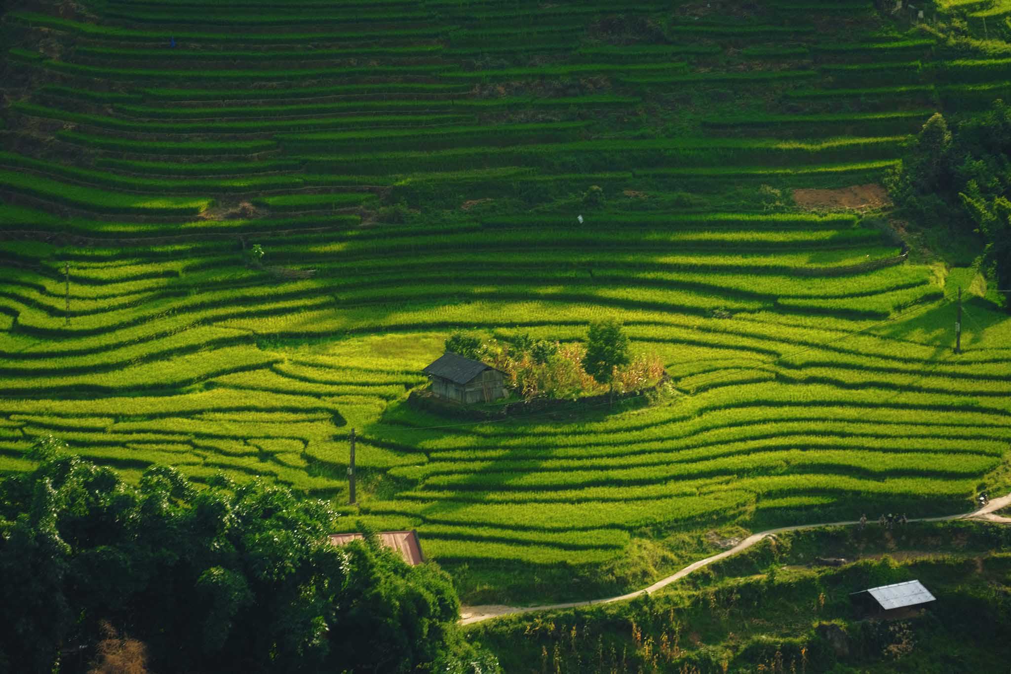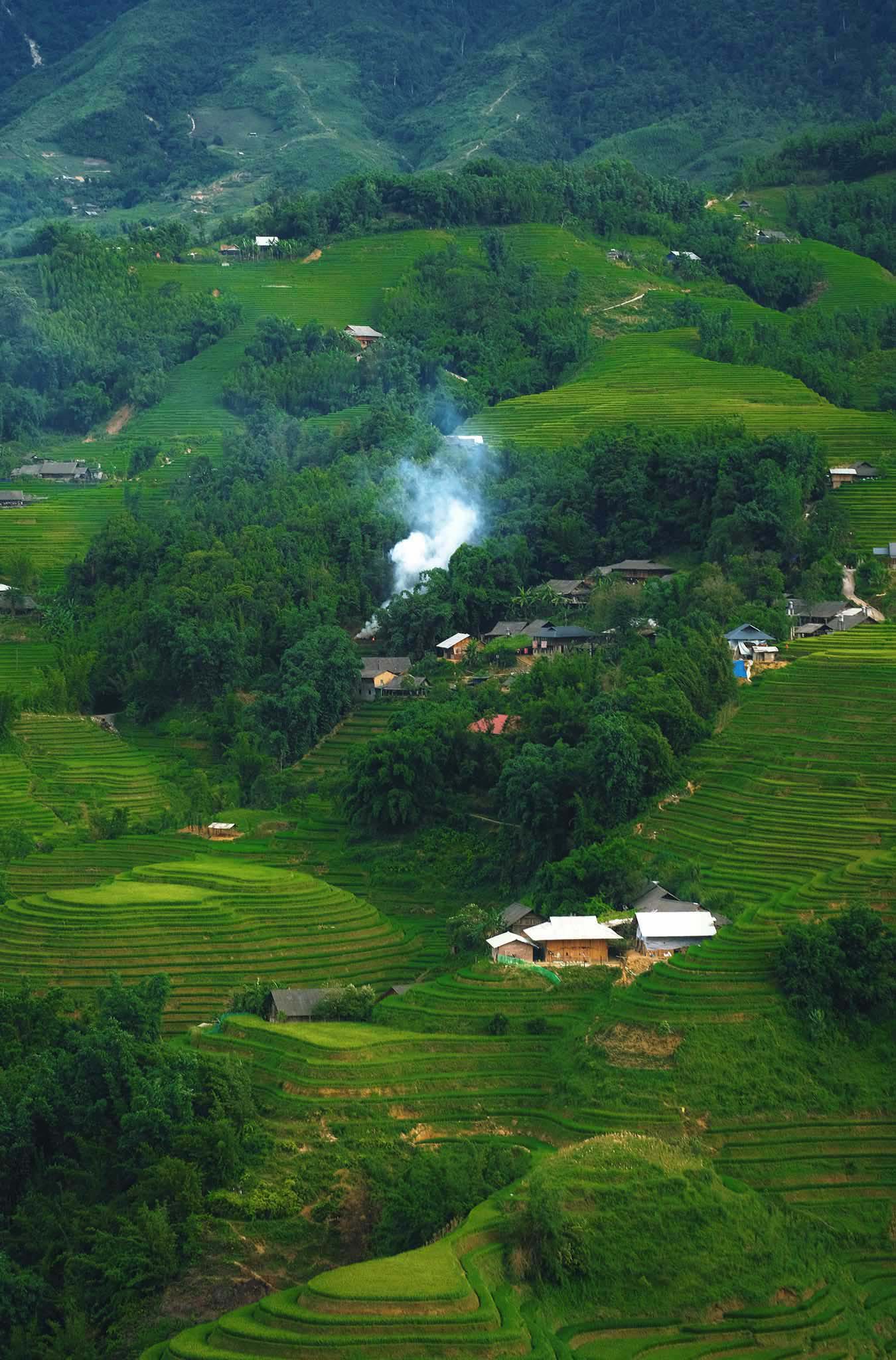 The landscape there blends steep green mountains, small wooden houses nestled on hillsides, and drifting kitchen smoke at dusk. Visitors can follow dirt paths through rice fields, walk along small streams, or trek through forests and waterfalls.