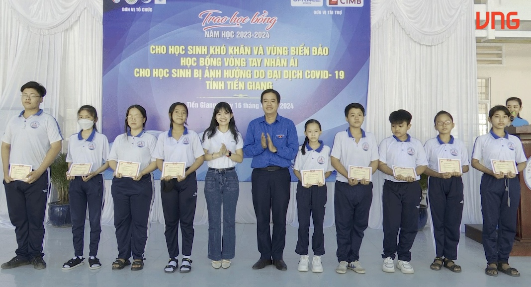 On April 16, 2024, disadvantaged students in Ben Tre and Tien Giang provinces received scholarships from VNG’s Dream Maker Foundation and the Vu A Dinh Scholarship Fund. Specifically, a total of 150 regular scholarships, each worth VND1 million, were awarded, including 20 Vu A Dinh scholarships and 130 scholarships from the “For Beloved Hoang Sa – Truong Sa” club.